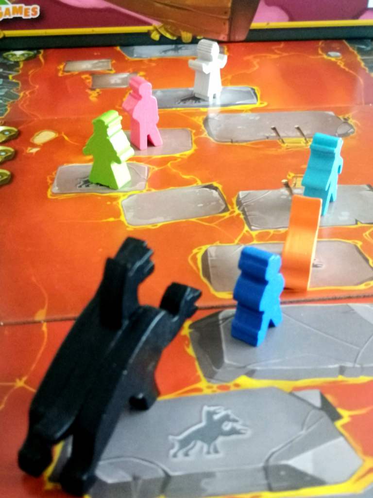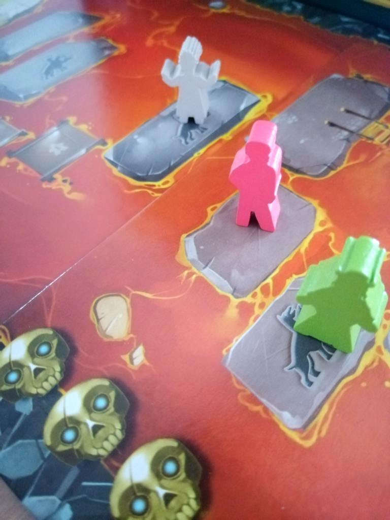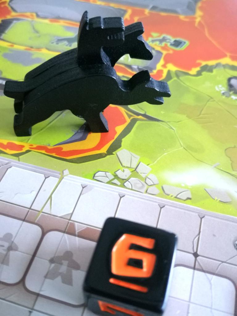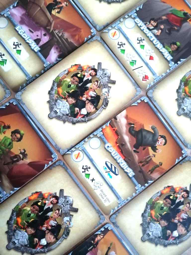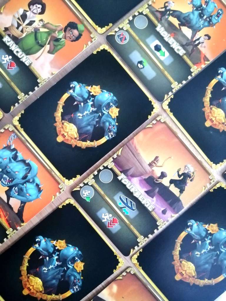 Que vous incarniez un aventurier ou Cerbère, les tours de jeu restent identiques. Par contre, vous ne jouez pas avec les mêmes faces des cartes actions, vous piochez des cartes « bonus » dans deux paquets différents et surtout vous n’avez pas le même objectif final. A leur tour de jeu, les joueurs doivent jouer une carte « action » de leur main, en appliquer l’un des deux effets possibles et éventuellement jouer une carte « survie » ou « trahison » avant ou après leur carte « action ». Les cartes des aventuriers permettent d’évoluer sur le plateau , de faire évoluer les autres joueurs tout en ayant comme contrainte d’augmenter la vitesse du dé de la rage de Cerbère et d’accélérer son départ à la « chasse ». Les cartes « cerbère » permettent de ralentir les aventuriers, voire de les faire reculer, mais également d’améliorer les condition de chasse de Cerbère. Lors d’une chasse, déclenchée par l’arrivée du dé de vitesse sur la dernière case de la piste de rage, Cerbère parcourt un nombre de cases égales à la valeur de son dé. Il peut capturer un aventurier en le rejoignant sur sa case. Cet aventurier devient alors Cerbère.