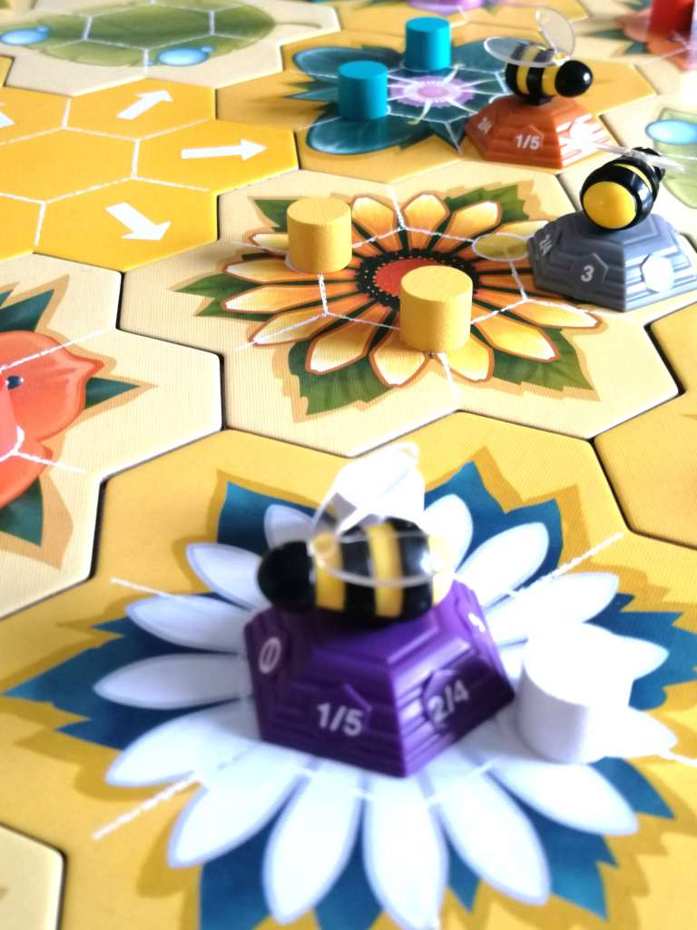 – Déplacement et récolte du nectar. Le joueur pivote son abeille dans le sens de son déplacement, effectue son vol et récolte le nectar de la case sur laquelle elle termine son déplacement. Si elle atterrit au centre d’une fleur, alors le joueur récolte le « gros » nectar s’y trouvant et un des « petits » nectars autour d’elle.