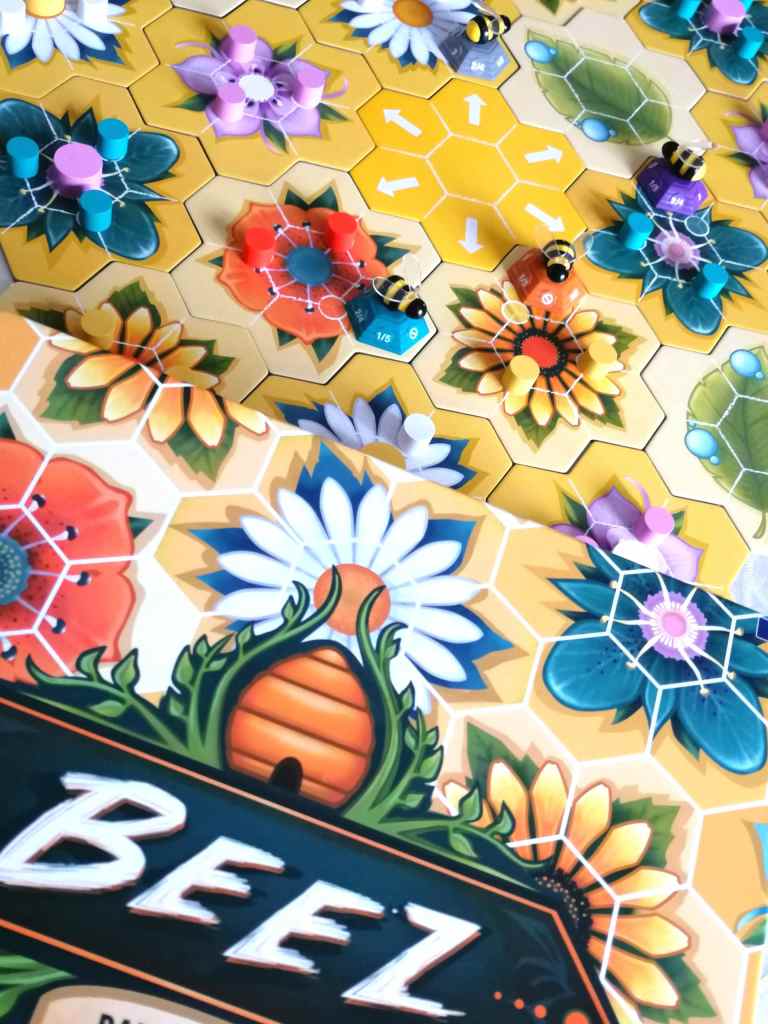 Celui là, je l’attendais depuis un sacré moment ! Comment résister à un matériel pareil ? J’en « butinais » d’avance à chaque photo postée par l’éditeur sur les réseaux sociaux. Next Move ne sort pas vingt jeux par an, mais leurs nouveautés sont toujours surveillées de très près depuis le succès du fameux AZUL, dont je ne me lasse toujours pas et que je continue de faire découvrir aux personnes passant le pas de ma porte. BEEZ s’inscrit clairement dans le même esprit. Les règles sont simples et se mettent au service d’un jeu délicat et malin. Un des grands atouts du jeu, c’est de nous faire croire que l’on ne joue pas à un jeu abstrait de placements calculatoires sans histoire. Et pourtant, c’est exactement ce qu’est BEEZ. La thématique, écologique et zen, est parfaitement mise en valeur. Mais on ne va pas se mentir, on cherche surtout à rentabiliser chaque mouvement pour récolter des « ressources » que l’on tente de placer aux endroits les plus intéressants afin de marquer un maximum de points en rapport avec les objectifs à réaliser… Et tout ça, en essayant de prévoir au mieux le prochain déplacement. Ça ne vous rappelle rien ? Ici, les « nectars » ont remplacé le « carrelage » et les « azulejos » se sont transformés en « miel ». Le thème est plus vendeur et bucolique mais l’esprit est très proche. Et pourtant, les sensations de jeu sont tout autres et les deux jeux ne font absolument pas doublon. BEEZ est clairement plus « solitaire » dans la manière d’appréhender les objectifs, même si une course s’engage sur la récupération de certains « nectars », elle est moins virulente et laisse donc les interactions au second plan. Alors, vous allez me dire que BEEZ projette par conséquent une atmosphère plus froide… Et bien pas du tout. C’est presque l’inverse en fait. Les illustrations pleines de joie et le thème d’une exquise douceur y sont sans doute pour quelque chose… Mais pas que. Il se produit quelque chose d’assez inexplicable. Alors que les mécaniques ont tout pour que chaque joueur reste plongé dans sa ligne tactique directrice sans lever la tête de son pot de miel, BEEZ surprend par une ambiance plutôt détendue et bien moins polaire que son système de jeu le suggère. Bon, c’est pas la « poilade » non plus, tant le jeu requiert de la concentration et de l’anticipation. Surtout que cela peut aller très très vite ! Les tours de jeu s’enchaînent aussi rapidement que les parties. BEEZ, de premier aspect familial, est un véritable casse tête, très malin, qui vous séduira inévitablement par un matériel splendide et une mécanique très épurée et efficace. La rejouabilité est assurée par la disposition différente des tuiles du plateau modulable et l’association différente des cartes objectifs à chaque partie, même si, elles sont peu nombreuses et qu’on en fait le tour en trois petites parties. Très instinctif et facile à prendre en main, tout en proposant une belle profondeur, BEEZ fait l’unanimité autour de moi. Et quand le plaisir est immédiat, on peut parler de coup de cœur.