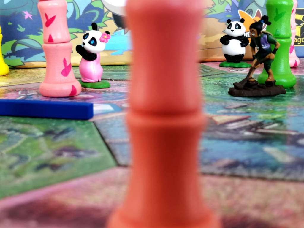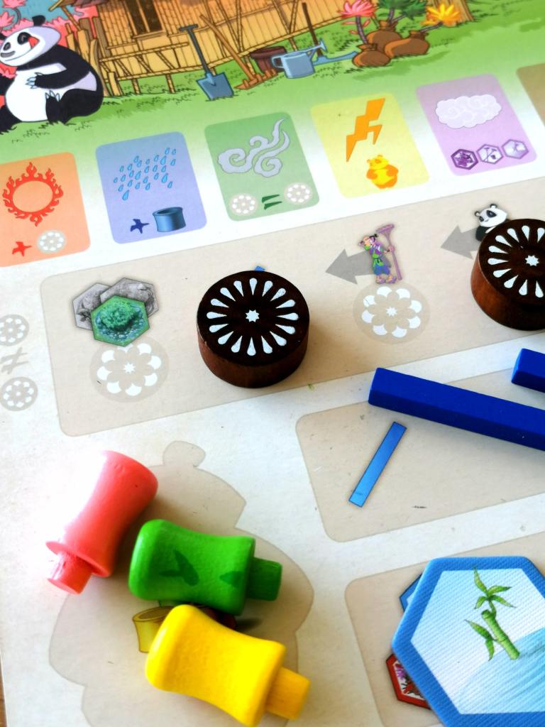 4 – Déplacer le panda en ligne droite. Le panda mange une section de bambou de la parcelle d’arrivée que le joueur actif récupère.