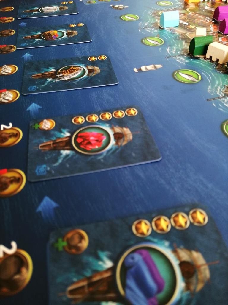 ° Marché : acheter une carte bateau pour obtenir des points de victoire. Chaque carte coute un certain prix en marchandises. L’achat de cartes « bateau » et le système de remplacement des cartes achetées font évoluer le cours des marchandises.