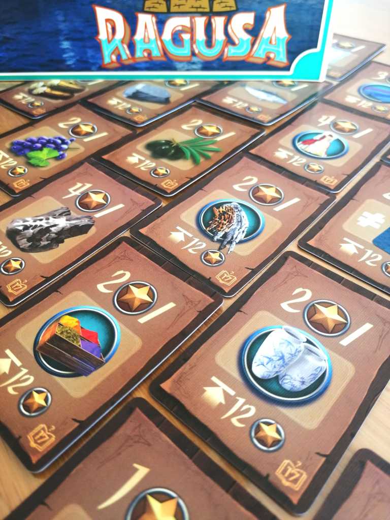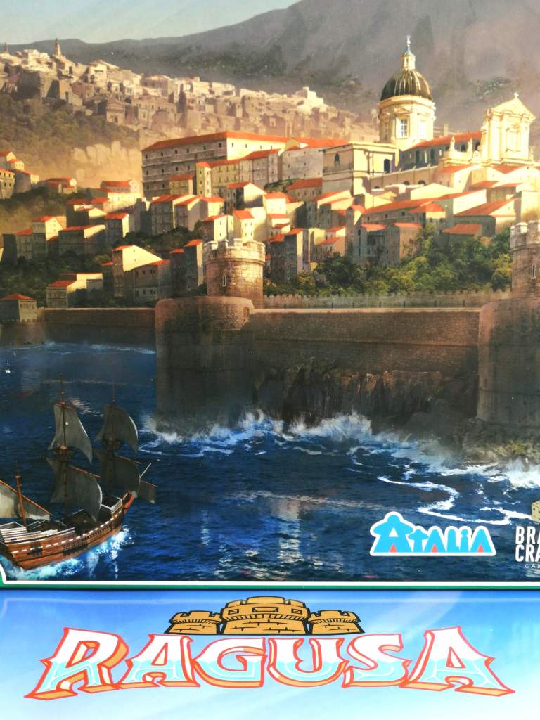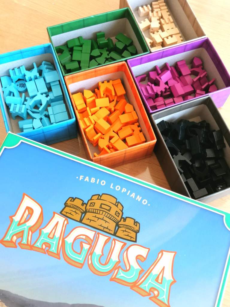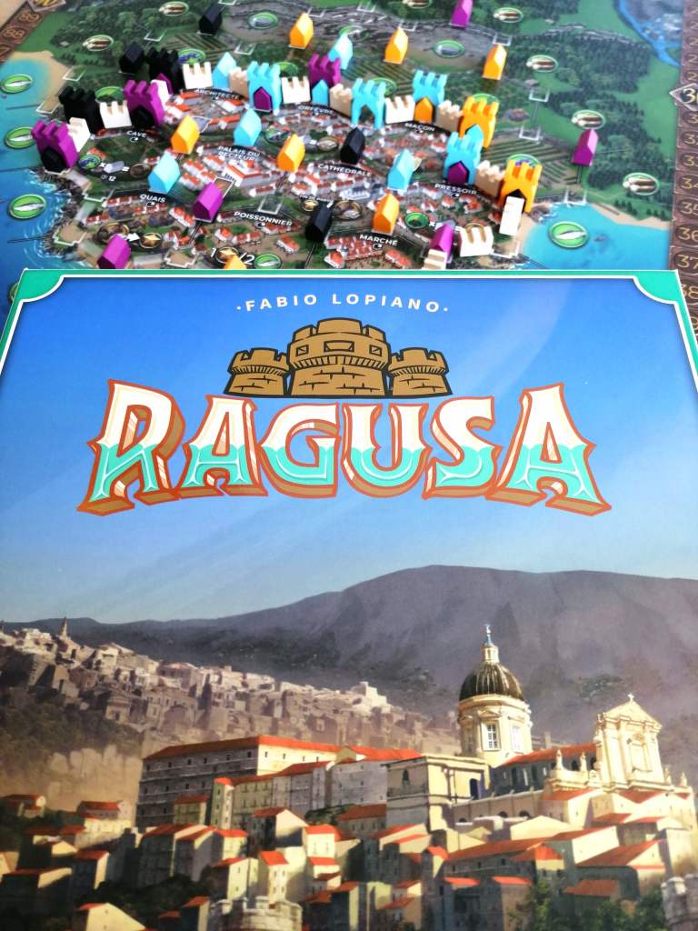 J’attendais RAGUSA depuis de nombreux mois. Sa promesse de proposer une mécanique abstraite de placement associée à de la gestion de ressources sous forme de pose d’ouvriers (de maison) me mettait l’eau à la bouche. En appréciant de plus en plus les jeux épurés, s’expliquant en quelques minutes, RAGUSA cochait quasiment toutes les cases de ce que j’attends en ce moment d’un jeu de société, sans perdre pour autant l’envie de me creuser un peu la tête devant des voies stratégiques nombreuses. Sur ce point RAGUSA réussit parfaitement l’exercice. Les règles sont très accessibles et la simplicité d’un tour de jeu est saisissante. Les joueurs doivent uniquement poser une de leurs maisons à l’intersection de trois hexagones. Mais les conséquences de cette action minimaliste sont nombreuses à la fois sur leurs propres lignes directrices à suivre mais aussi et surtout sur les possibilités qu’ils offrent à leurs adversaires. RAGUSA oblige à des interactions fortes et poussent les joueurs à réfléchir presque davantage aux actions que les adversaires pourraient faire si l’occasion se présentait. Il ne faut pas se tromper, RAGUSA est avant tout un jeu d’opportunisme dans lequel il faut savoir occuper un emplacement au bon moment et réunir les conditions nécessaires à une activation efficiente de l’action correspondante. La lutte pour le placement de chaque élément est féroce, tout en étant parfaitement pacifique. En effet, et c’est un des gros point fort du jeu, RAGUSA permet de s’embêter avec élégance et sans aucune agressivité. Par contre, chaque placement est extrêmement tactique, et les résultats très tendus de chaque partie témoignent de l’importance du détail dans les choix à effectuer. La mécanique est ingénieuse et les tours de jeu déroulent sans forcer jusqu’au décompte final venant clore des parties plutôt rapides et du coup frustrantes pour ce type de jeu. Il manque à chaque fois quelques tours pour véritablement aller au bout de nos envies tactiques. Sur le plan esthétique, RAGUSA n’est pas des plus attrayant. Même si le rendu du plateau final est très joli, les illustrations des ressources, cartes et du plateau sont sombres et assez peu modernes, ce qui aurait tendance à refroidir l’atmosphère autour de la table. Autre point pouvant casser le rythme pourtant soutenu entre deux tours de jeu, c’est la nécessité de porter une attention considérable aux actions de chaque adversaire. Si aucun temps mort n’existe et que les joueurs sont tous potentiellement concernés tout le temps, l’activation générale des actions peut prendre un peu de temps et sont sujettes à pas mal d’oublis, notamment sur les premières parties. RAGUSA est original dans la forme que prend sa mécanique classique de production de ressources et vente de marchandises. En effet, elle est associée à un côté abstrait de positionnement et de construction surprenant et efficace. Tout fonctionne parfaitement. Pourtant, il m’a manqué quelque chose pour vraiment l’apprécier comme je l’espérais. La sauce n’a pas prise à la hauteur de mes attentes alors qu’objectivement les ingrédients sont plutôt savoureux. Je n’ai pas vraiment d’explication si ce n’est peut être son côté quelque peu répétitif. RAGUSA est pourtant un bon jeu de part les interactions fortes qu’il impose et la fluidité qu’il présente tout en proposant une belle profondeur en à peine une heure de temps. Il est une passerelle parfaite vers des jeux plus complexes et apparait plutôt singulier dans sa façon d’agencer les éléments mécaniques entre eux.