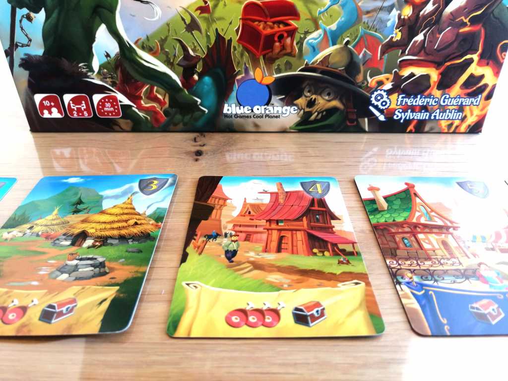 ° Le Royaume des Humains : Quatre lieux sont disposés en début de partie au centre de la table, ayant une valeur de défense (bouclier). Pour pouvoir attaquer un lieu, il faut pouvoir au minimum égaler la valeur défensive de la carte avec la valeur d’attaque (épée) de la horde active. Après avoir attaqué un lieu, le joueur récupère le butin indiqué sur la carte lieu et défausse la carte.