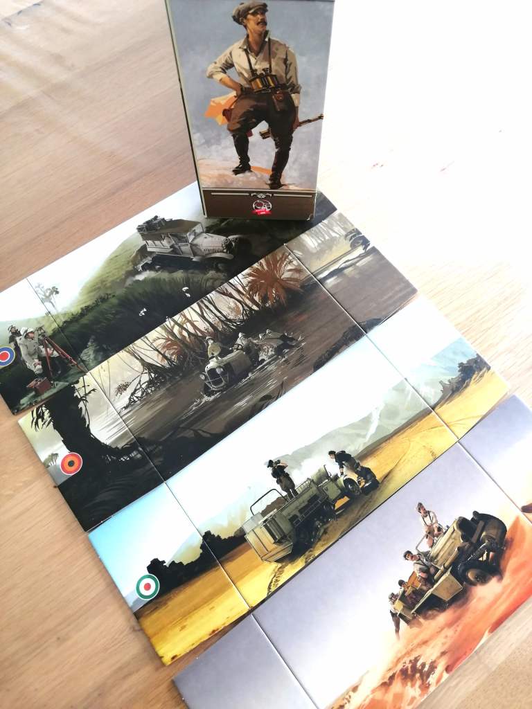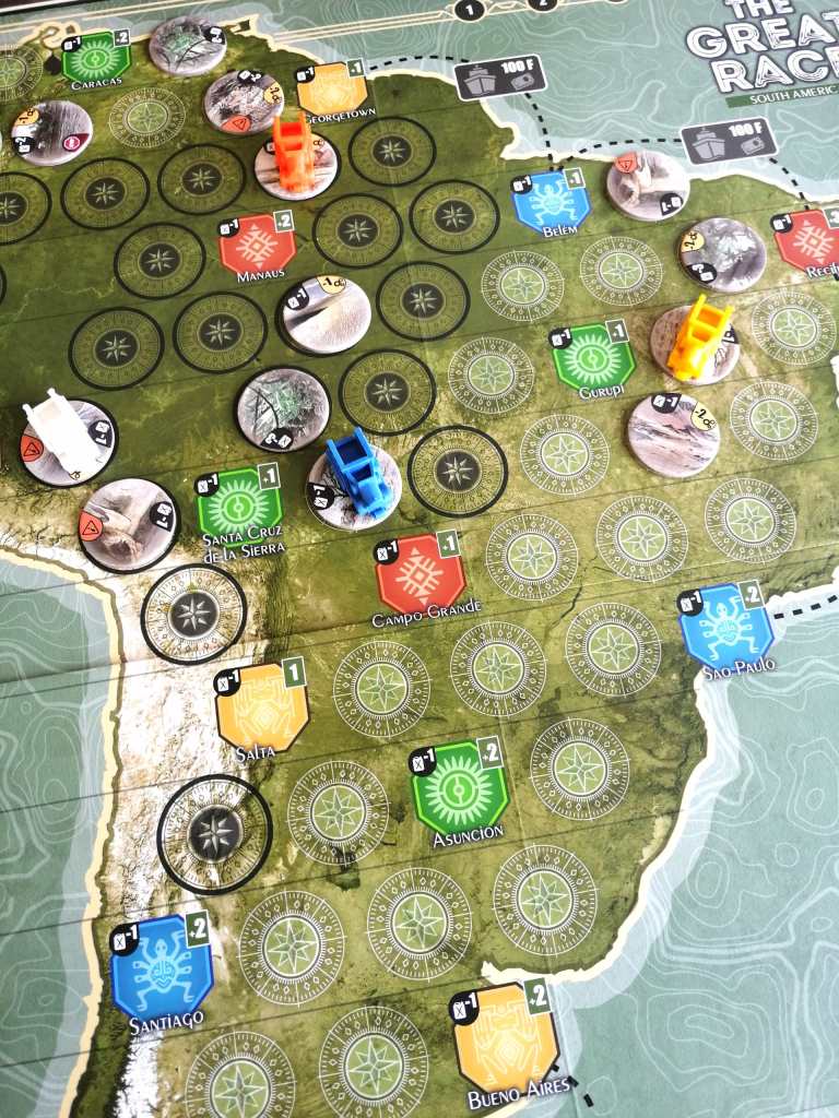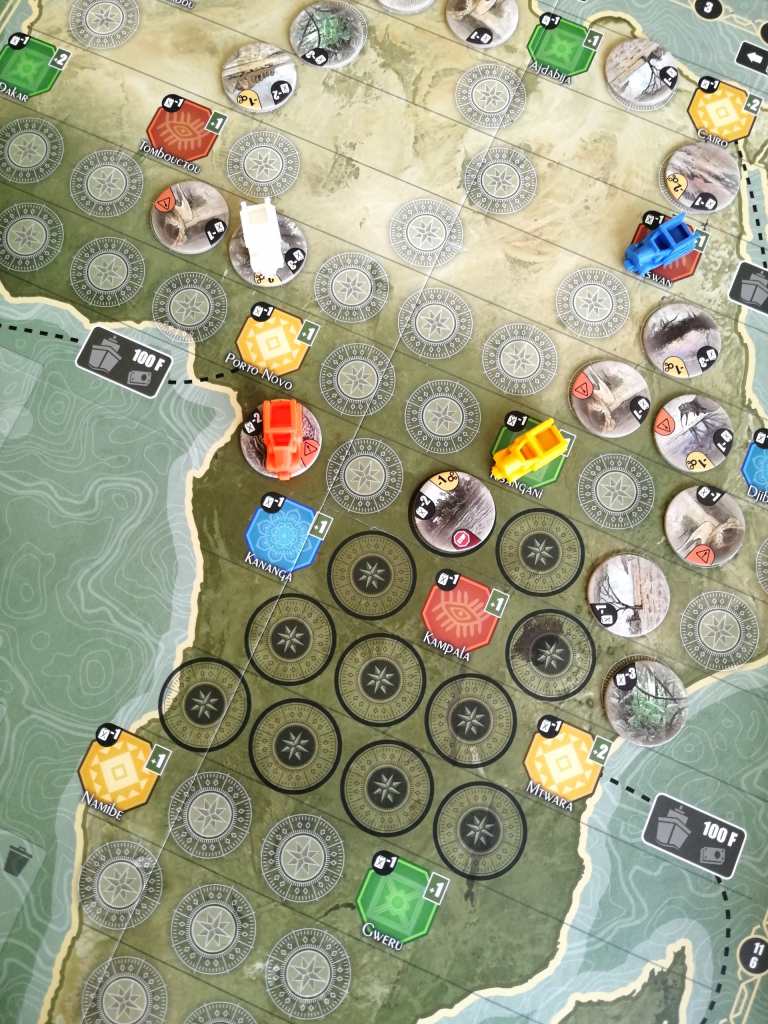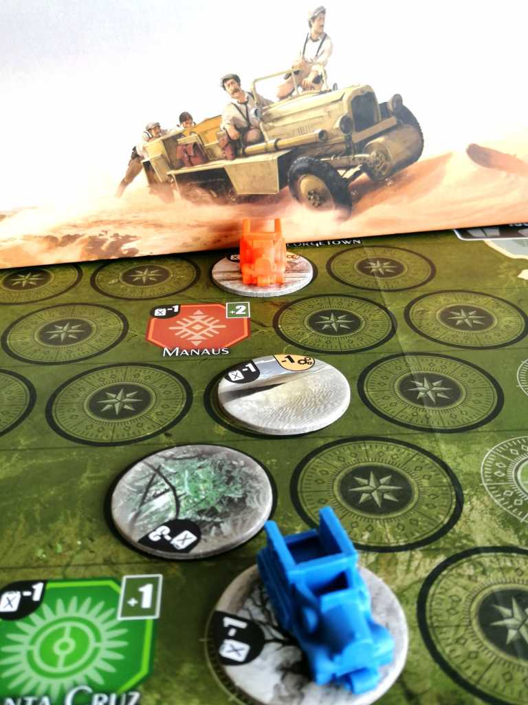 THE GREAT RACE est la bonne surprise de ce début d’année. Le fait même de parcourir l’Afrique ou l’Amérique du sud à bord d’une autochenille des années trente est véritablement exaltant. L’immersion est complète et immense. Elle repose à la fois sur un matériel très agréable rappelant en détails cette période et sur une mécanique rendant compte à chaque instant de la course palpitante que les joueurs vont vivre. Des règles très accessibles soutiennent ce projet ambitieux, ce qui permet à un public bien plus large que ce que l’on aurait pu penser, de participer à cette aventure rocambolesque. En effet, les joueurs auront beau prévoir et anticiper au maximum les aléas des différents terrains rencontrés, le voyage ne sera pas de tout repos. Il s’agira de se frayer un chemin à travers les déserts, et la jungle peuplés d’animaux sauvages et dangereux. Les conséquences sur la vitesse de croisière des autochenilles seront conséquentes, ainsi que sur leurs états de fonctionnement. Rien est laissé au hasard dans THE GREAT RACE puisque chaque élément détermine vos droits à effectuer certaines actions. Ainsi, l’essence permet bien évidemment d’avancer sereinement, le moteur conditionne le nombre de cases de déplacement possible et le châssis détermine le nombre de cartes pouvant être détenu en main. Ce sont ces liens entre actions et capacités qui donnent une tension palpitante au jeu, reposant finalement sur de la gestion pure et dure. Et pourtant, tout repose sur une mécanique de planification dans laquelle il va falloir viser au mieux par rapport aux objectifs personnels visés mais aussi et surtout tenir compte des probables actions adverses et de l’ordre du tour de jeu. THE GREAT RACE propose des interactions multiples et conséquentes. Il va falloir à certains moments user et profiter des chemins initiés et empruntés par d’autres joueurs pour pouvoir mieux, par la suite, les abandonner et leur mettre des bâtons dans les roues. Les alliances se font et se défont. La solidarité est la plupart du temps assez éphémère ou hypocrite. J’ai été également séduite par le rythme alternatif que propose la course, entre phase d’observation, d’attente et d’accélération. Il s’agit pourtant bien d’arriver en première position sur la case d’arrivée. Les points distribués, fonction de l’ordre d’arrivée, peuvent faire largement la différence. Mais, la course est marquée par des choix tactiques permettant les détours et arrêts pour mieux redémarrer par la suite. Ce jeu parallèle avec le rythme de la course permet certaines erreurs, qui souvent dans une course traditionnelle ne sont quasiment jamais rattrapables. Il provoque également une analyse détaillée du parcours et des options multiples et changeantes. Rien n’est jamais acquis, et les rebondissements nombreux montrent à quel point tout est possible jusqu’à la fin de la partie. Les cartes jouent un rôle essentiel dans ces situations changeantes. THE GREAT RACE propose une immersion convaincante en milieu naturel. La course s’avère subtile, entre programmation, gestion et fortes interactions. La progression de chaque joueur est à la fois personnelle, mais basée fortement sur les ouvertures que vont permettre les autres concurrents. A ce petit jeu là, il faut savoir se placer discrètement pour pouvoir mieux profiter de chaque occasion qui se présente ou bien foncer droit devant. Les possibilités tactiques sont nombreuses et le jeu se renouvelle très bien d’une partie à l’autre. La présence du hasard s’articule harmonieusement avec les mécaniques proposées. En effet, la chance se provoque en s’arrêtant dans les villes afin de piocher des cartes ou en effectuant l’action « éclaireur » afin de choisir à quelle sauce les aventuriers pourront être mangés. Une très très belle épopée dans deux continents absolument extraordinaires.