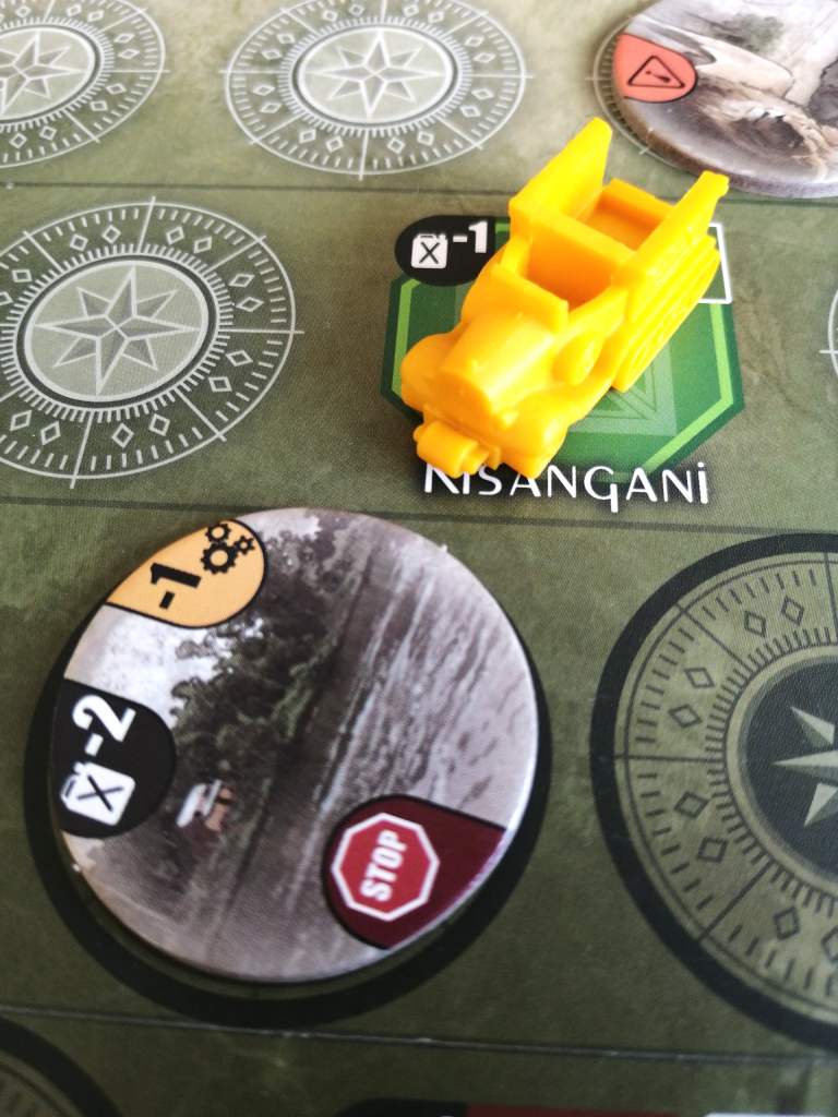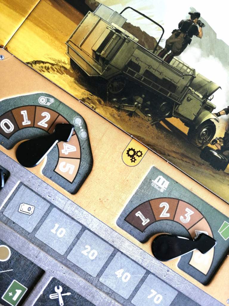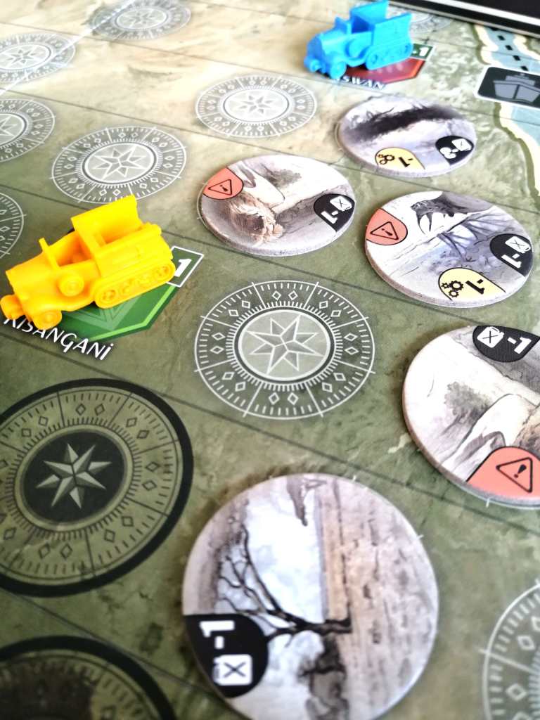 ° Ils doivent réaliser l’action d’un assistant ou passer leur tour. Les actions consistent à récupérer de l’argent, partir en éclaireur explorer le terrain en piochant deux tuiles du sac et en les positionnant sur le plateau de jeu, récupérer une carte « ressource », réparer le moteur ou le châssis du véhicule ( le coût est moindre dans les villes), piloter en avançant sur les différentes cases du plateau (qu’elles aient été découvertes ou à l’aveugle), se protéger des éventuels dangers ou défausser une tuile terrain. Le niveau de capacité du moteur détermine le nombre de cases de pilotage possible et le niveau de capacité du châssis détermine le nombre de cartes en main qu’il est possible de conserver. Chaque tuile « terrain » implique une dépense en essence et/ou en mécanique, ainsi qu’un possible danger provoquant des dégâts sur le moteur ou le châssis. Une autochenille ne peut plus avancer dès lors que son niveau d’essence et/ou la capacité de son moteur sont trop bas pour répondre aux conditions de la prochaine tuile terrain sur le parcours. Des tuiles peuvent également bloquer l’avancée d’un véhicule.