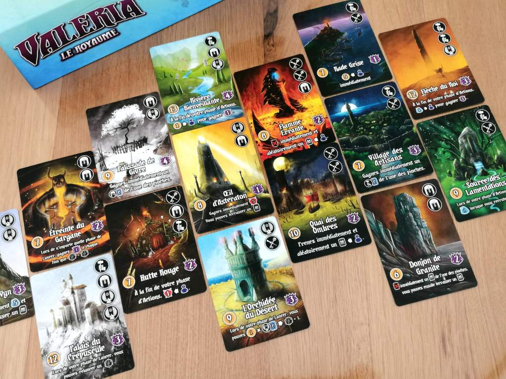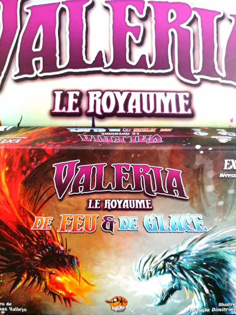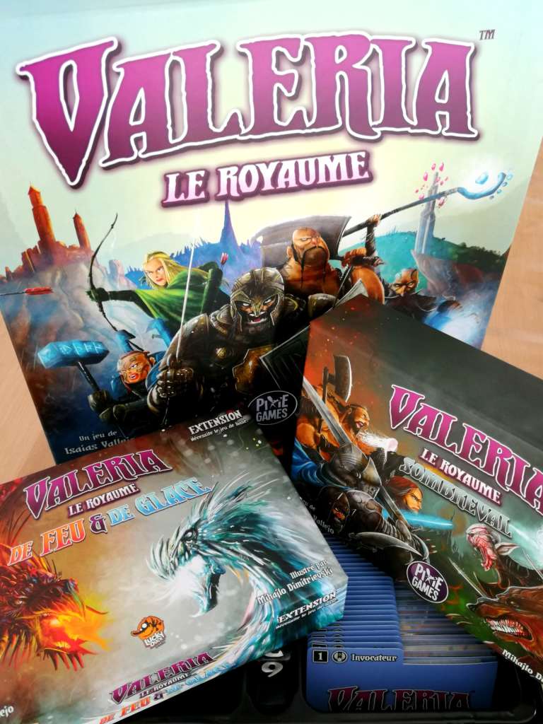 VALERIA c’est d’abord un Royaume fantastique, peuplé de citoyens vigoureux prêts à le défendre contre des invasions permanentes de monstres et d’immondes créatures. Cette thématique très attrayante est prétexte à des illustrations époustouflantes, très stylisées et taillées sur mesure pour porter un jeu pourtant très mécanique. En reprenant le système de jeu de MINIVILLES pour en faire quelque chose de plus « costaud », VALERIA se revendique le penchant « joueur » de ce dernier. Le titre s’appuie essentiellement sur des cartes que l’on active par des lancers de dés à nos propres tours de jeu mais aussi lors des tours de nos adversaires. Le principe est extrêmement simple, par définition sans temps mort et implique une grande fluidité. Mais VALERIA LE ROYAUME va plus loin, en proposant un jeu de gestion de ressources parallèlement à la mécanique principale, dans le but d’acheter des cartes pourvoyeuses de points de victoire et correspondantes à un objectif personnel de fin de partie. Un jeu de cartes donc, avec des pouvoirs à activer, des guildes à collectionner, et tout ça dans un univers fantastique… Vous le voyez venir le jeu pour « barbus » en IUT d’informatique ? Pourtant il serait dommage de s’arrêter à cette idée caricaturale du public cible et de passer à côté d’un excellent jeu de collection. L’une des forces de VALERIA repose sur sa prise en main immédiate et sa grande fluidité alors que le titre présente une véritable richesse tactique et stratégique, bien que s’appuyant sur le hasard de lancers de dés. Il faudra être dans le bon timing de récupération de ressources pour pouvoir terrasser les monstres les plus intéressants ou construire les domaines les plus avantageux. C’est dans cette course aux cartes que l’on retrouve toute l’interactivité de VALERIA. Les cartes peuvent rapidement nous passer sous le nez. Tout va très vite, et il faudra faire preuve de vigilance sur les convoitises de chaque joueur. Les cartes Citoyen sont essentielles et représentent la base de notre moteur de ressources, indispensable à l’acquisition des cartes « monstre » et « domaine ». Trois types de cartes donc, l’un comme moyen d’obtention des deux autres. Le système est ingénieux et fonctionne à la perfection. L’univers proposé est vraiment très agréable, même si l’on est bien loin de l’immersion annoncée dans le préambule de la règle du jeu. Très clairement, on va acheter des cartes qui permettront d’en acheter d’autres. La mécanique est très forte, ce qui nous empêche parfois de jeter un œil sur les illustrations magistrales de Mihajlo Dimitrievski. VALERIA LE ROYAUME brille également par sa grande accessibilité. L’iconographie est parfaite et facilite grandement l’expérience de jeu. Les deux actions à effectuer parmi quatre sont compréhensibles en quelques secondes. Le décompte final porte sur l’essentiel, et est rapide, concret, et extrêmement simple. En fait, tout a été conçu pour garantir le plaisir des joueurs sans élément pouvant le contrarier ou chichi pouvant le parasiter. Cette idée se ressent jusqu’à la qualité sans faille du matériel ou l’intelligence des rangements proposés dans la boîte de jeu avec l’utilisation d’intercalaires permettant d’ordonner les différentes cartes afin d’améliorer les mises en place des parties futures. En ce sens VALERIA LE ROYAUME propose une expérience ludique globale de très haute qualité. Le jeu s’adapte parfaitement quelque que soit le nombre de joueurs et leur expertise et sa rejouabilité est impressionnante, notamment avec l’apport des différentes extensions apportant un grand nombre de cartes supplémentaires, et leurs lots de possibilités tactiques associées. A la fois léger et d’une grande richesse, tout en restant à la portée de tous, VALERIA cache son exigence dans un sentiment de liberté immense. D’ailleurs, l’abondance de certaines ressources et l’utilisation de la magie comme joker peut légèrement abaisser l’intensité des parties et rendre les objectifs visés parfois facilement atteignables. La montée en puissance des possibilités des joueurs est saisissante, même si la mécanique peu parfois devenir répétitive, et influer sur l’impression de longueur du temps de jeu. VALERIA LE ROYAUME est un excellent jeu intermédiaire réclamant anticipation, réflexion, observation, opportunisme et chance ; des éléments résolument ludiques !