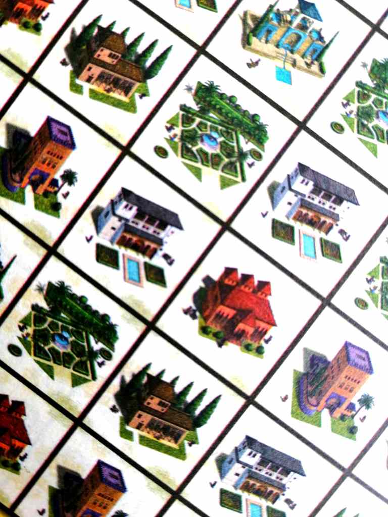 – Construire un Bâtiment. Au début de son tour, le joueur actif lance les deux dés disponibles devant lui et les place sur les emplacements correspondants. Il choisit ensuite une case à cocher (un bâtiment) sur l’une des intersection d’un dé jaune et d’un dé bleu. Ensuite, il reporte le bâtiment coché sur la feuille de score globale et remporte éventuellement les points de victoire associés s’il s’agit du dernier bâtiment coché de ce type. Enfin, il retire de sa feuille les deux dés lui ayant servis à cocher le bâtiment, les place devant lui et positionne les deux autres dés sur la feuille personnelle de son voisin de gauche sans changer leurs valeurs.