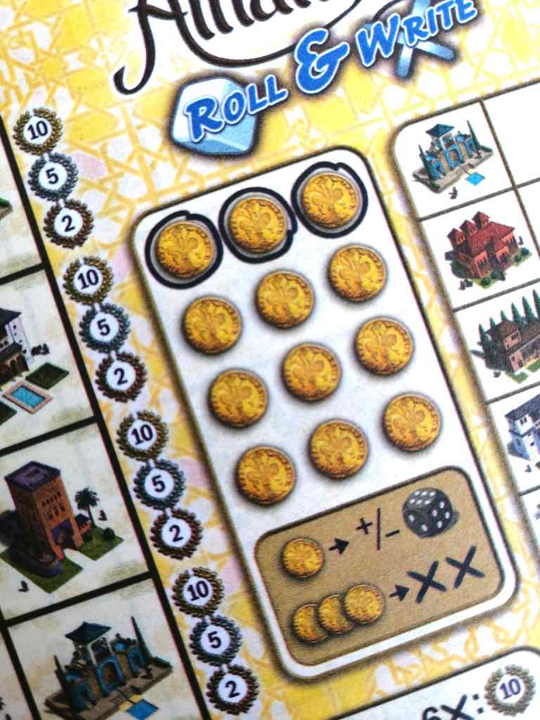 – Gagner des pièces. Le joueur actif entoure un nombre de pièces sur sa feuille personnelle correspondant au nombre de bâtiments déjà construits aux intersections des quatre dés.
