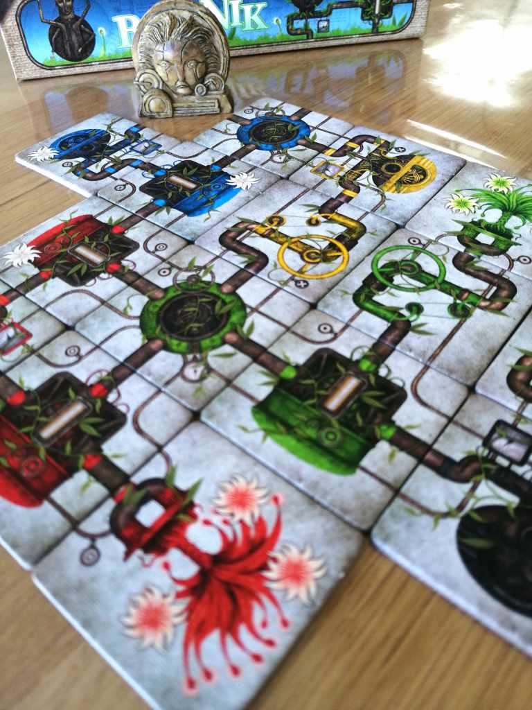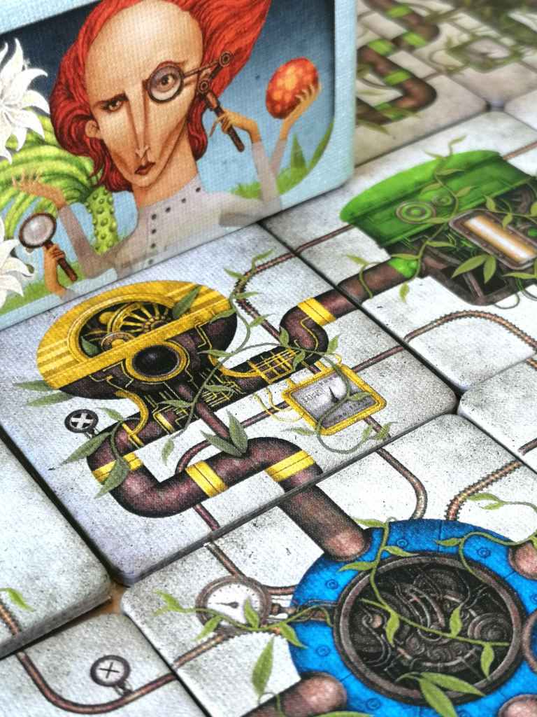 BOTANIK surprend déjà esthétiquement par son style « steampunk » mais surtout par l’aspect saccadé de chaque coup de crayon. Le résultat peut ne pas faire l’unanimité mais interpelle. Personnellement, je suis cliente. Le thème, assez secondaire quand on connaît la force de la mécanique, imprègne tout de même avec cohérence le jeu. Mais ce n’est pas l’essentiel car le titre met en scène avec beaucoup de talent un duel tactique très malin aux sensations de jeu novatrices. Et ce n’est pas évident de faire original quand il s’agit de connexions de tuiles. Ici tout repose sur une seule action, à savoir choisir une tuile parmi trois et la poser sur une case du plateau de jeu, soit au centre sans contrainte, soit de son côté par correspondance de forme ou de couleur avec la tuile adjacente de la ligne centrale. Ce choix peut apparaître limité en terme stratégique alors qu’en réalité, il est un véritable petit casse tête. La tuile va t’elle nous servir favorablement, enquiquiner l’adversaire ou neutraliser une situation ? Et ces trois possibilités s’articulent autour d’une temporalité incertaine, entre immédiateté et futur proche. Il faut trouver le juste milieu entre se réserver beaucoup de tuiles et en débloquer certaines sous peine de libérations non prévues nous contraignant dans nos plans d’assemblage. Ainsi, le tempo de chaque libération doit être pensé et pour nous, et contre notre adversaire, pour réaliser un « Puzzle » personnel idéal ou à l’inverse nuire aux connexions d’en face.