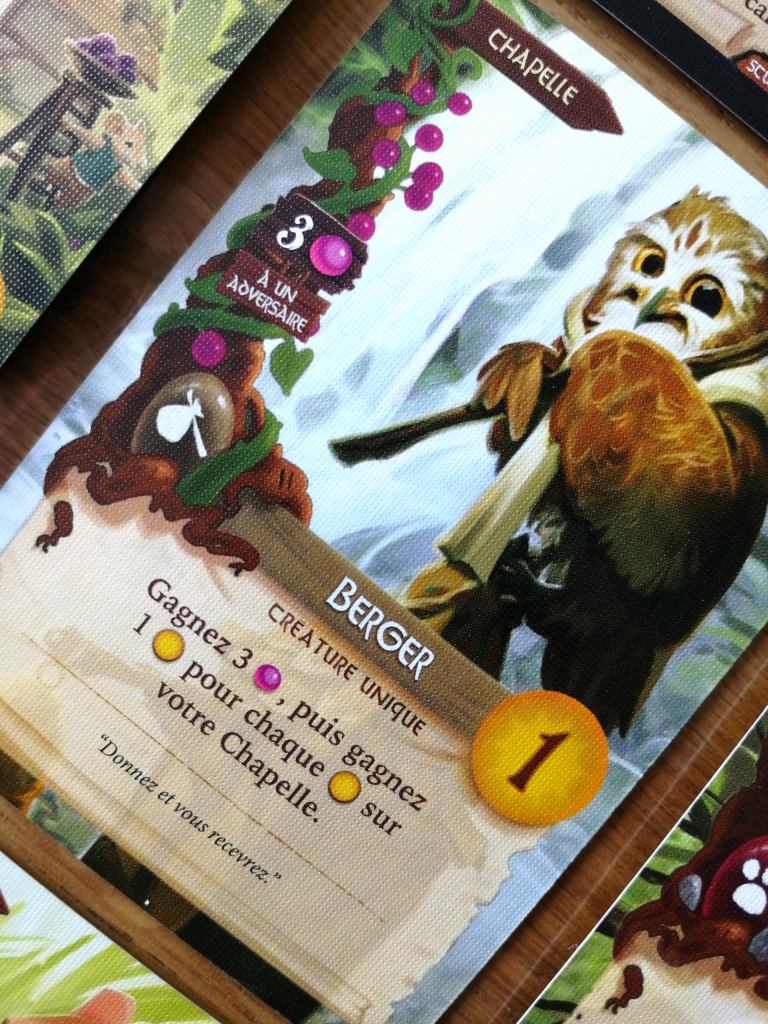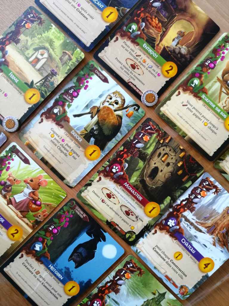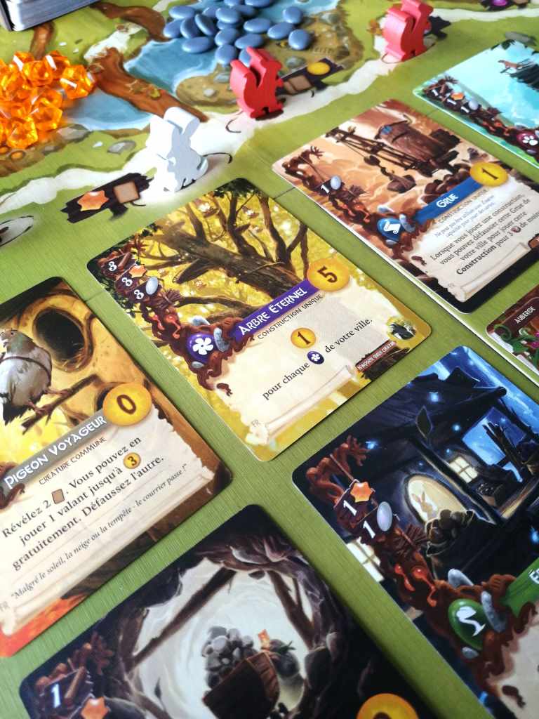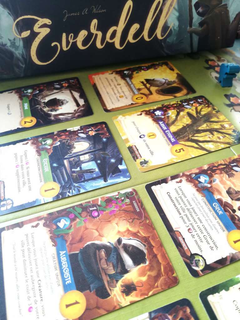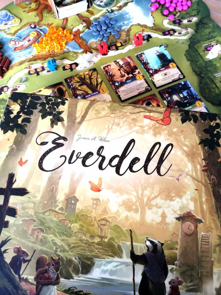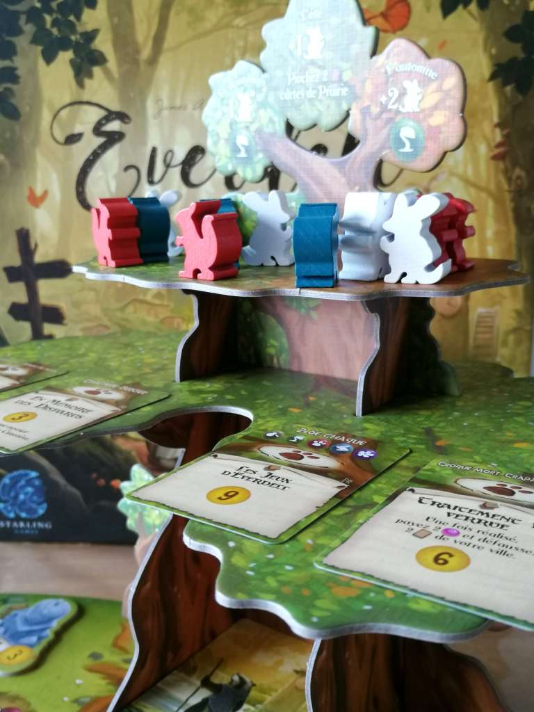 EVERDELL a fait sensation dès sa sortie. C’est sans doute un des jeux les plus photographiés et commentés sur les réseaux sociaux et autres blogs ludiques. Il faut avouer que son matériel sublime se prête parfaitement à l’exercice. L’arbre en trois dimensions fait rêver et les matières utilisées pour les ressources sont bluffantes de réalisme. Les illustrations de chaque carte sont superbes et transportent les joueurs dans le monde des créatures de la forêt, rappelant aux quarantenaires l’univers mignon des « Petits malins ».