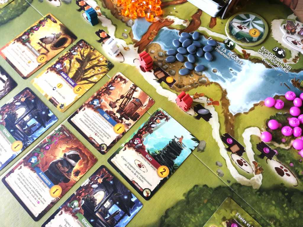 Effectivement, la grande accessibilité de ses règles du jeu est un atout considérable pour encourager les plus réfractaires aux jeux de « combos » dont je fais partie. L’introduction de pose d’ouvriers et de gestion de ressources rend certainement l’expérience plus douce. Les parties sont relativement rapides et rythmées par les passages des joueurs d’une saison à une autre. Ceci apparait comme une particularité intéressante puisque les joueurs, jouant pourtant alternativement, peuvent fréquemment ne pas se trouver au cours de la même saison. Parfois, certains espaces se libèrent par le passage à la saison suivante d’un adversaire. Ainsi, le tempo de pose d’ouvriers ou de cartes doit être murement réfléchi.