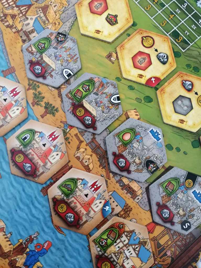 – Le palier atteint dans la Cathédrale et dans le Mur de la faim détermine un nombre de points de victoire. Chaque rangée vaut également un certain nombre de points de victoire à multiplier par le nombre de jetons bonus obtenus (rouge pour la Cathédrale, bleu pour le Mur de la Faim)