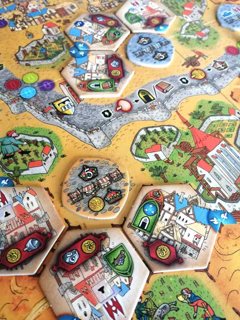 En prenant la pose de tuiles comme mécanique centrale, PRAGA CAPUT REGNI présente une vraie singularité. En effet, les jeux de tuiles sont majoritairement destinés à un public familial. Très peu de jeux experts se les sont appropriés. Ici, elles sont au service d’un jeu de gestion et de développement puissant, s’octroyant même le luxe de valser sur des objectifs de majorités. Ainsi, leurs placements sont le théâtre d’interactions indirectes très agréables, déjà omniprésentes dans le choix des tuiles Action ou la course aux Sceaux et aux tuiles Pont.