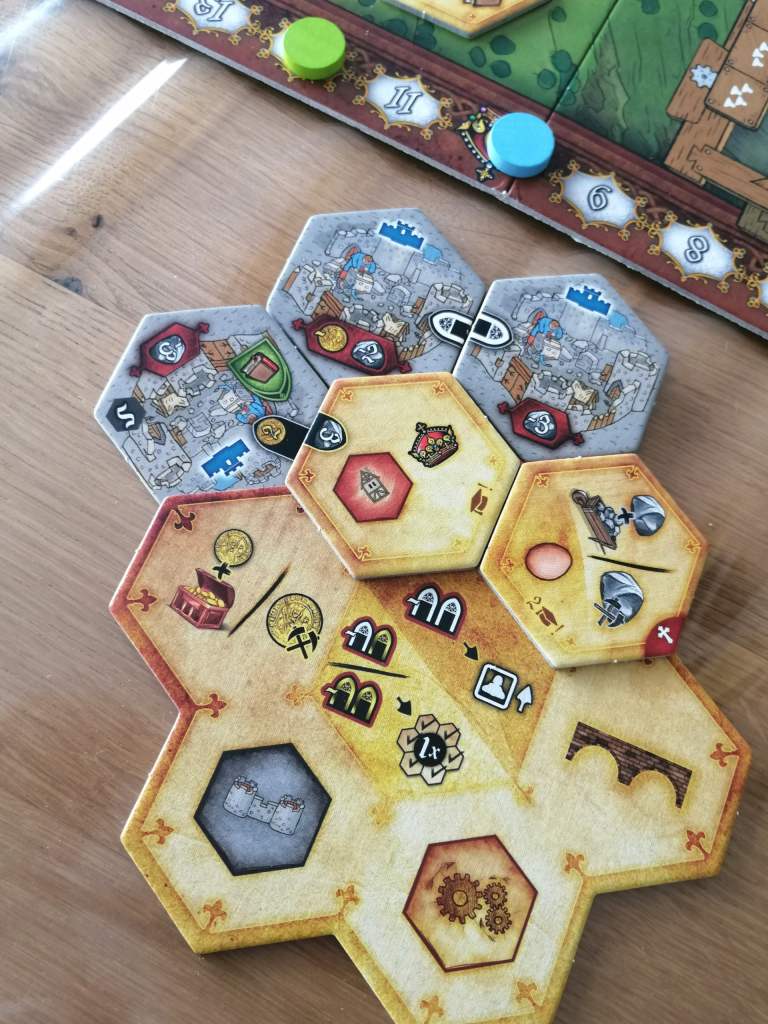 A chaque fois que le cube symbolisant les tours de jeu tombe dans le trou de la Grue, celui de la plateforme est décalé d’une case vers la gauche. En milieu de partie, des tuiles de niveau II plus puissantes remplacent les tuiles de niveau I.