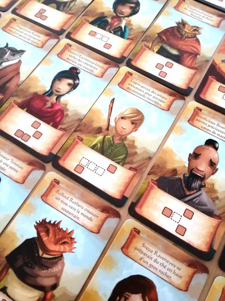 – A la fin de son tour, si une carte est entièrement complétée, le joueur ayant le plus de marqueurs sur celle-çi la récupère, la retourne sur sa face Personnage et l’ajoute à ses autres personnages utilisables. Un système d’enchères vient départager les égalités. Les autres joueurs possédant au moins un marqueur sur la carte récupèrent une pièce.