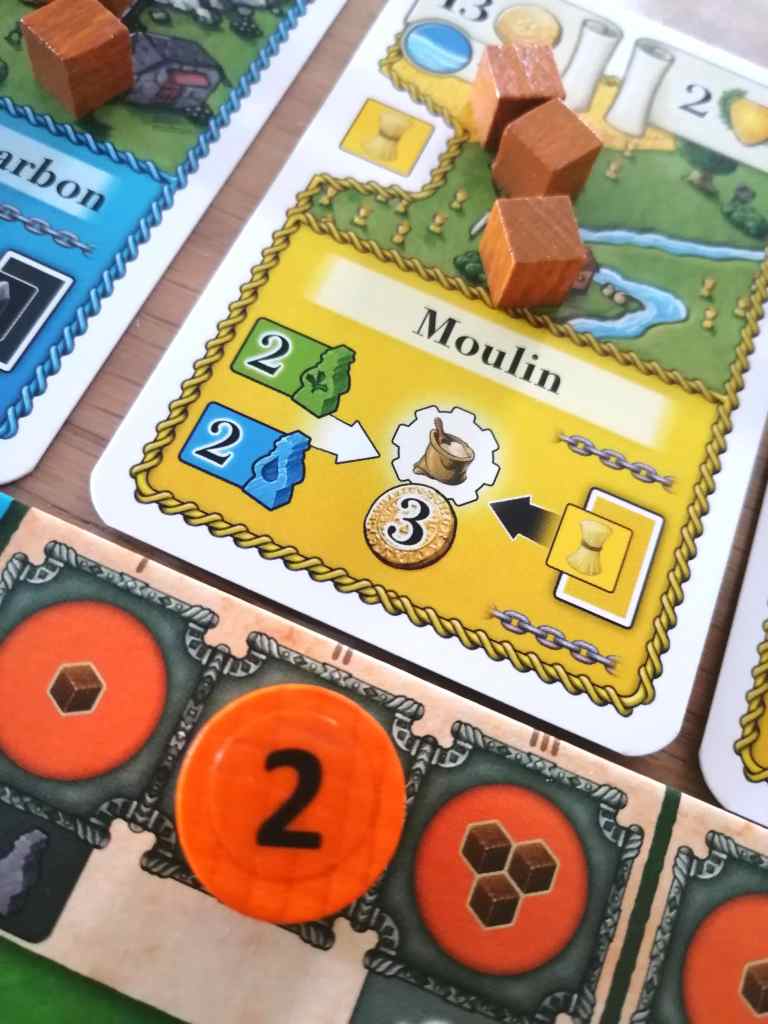° Production par Chainage. Il est possible de défausser des cartes Bâtiment de sa main qui fournissent la ressource indiquée en bas à droite de la carte de production pour produire. Il est aussi possible de produire une marchandise à partir d’une ou de plusieurs autres marchandises présentes sur d’autres cartes en les transférant de cartes en cartes présentant des icônes de chaînage correspondantes. Lorsque la production se fait par chainage, une marchandise supplémentaire de même type est récupérée en bonus.
