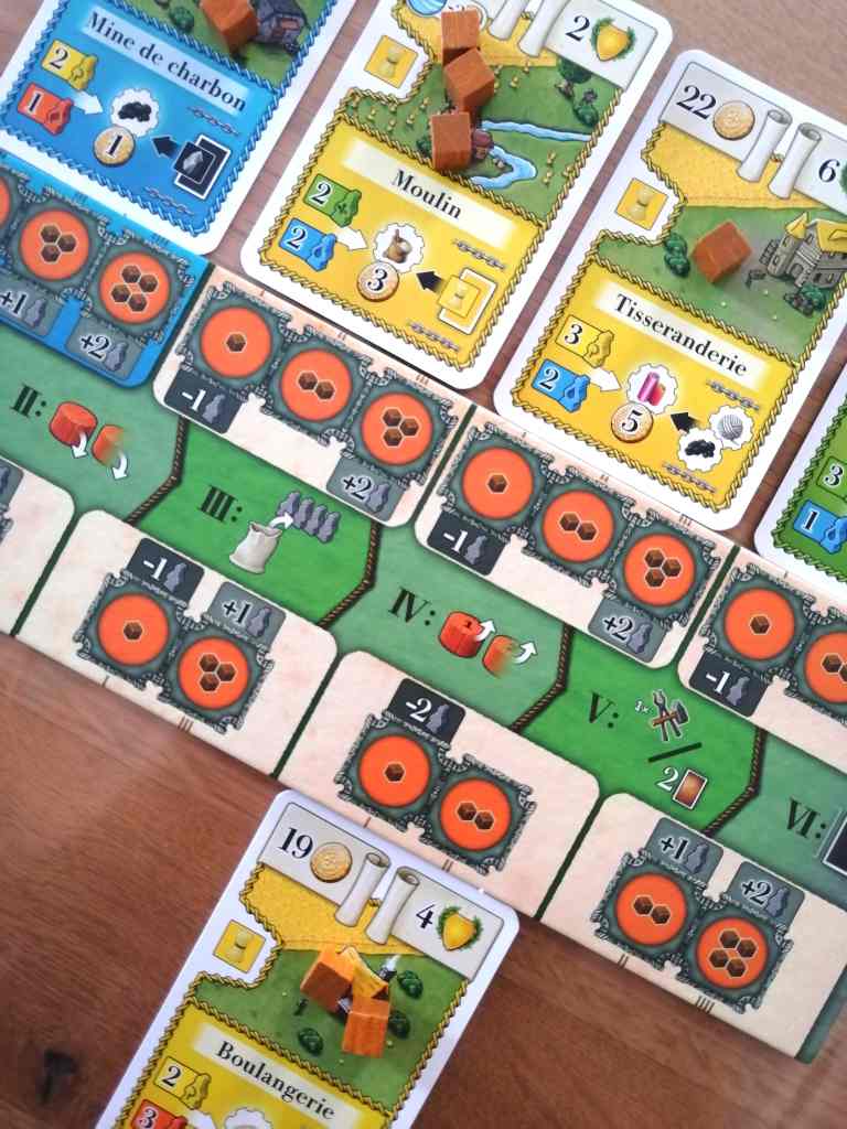 ° Progresser. Payer des pièces pour améliorer son plateau personnel. La portée des nouvelles maisons posées devient plus grande et le nombre de cartes à défausser pour remplacer un assistant devient moins important.