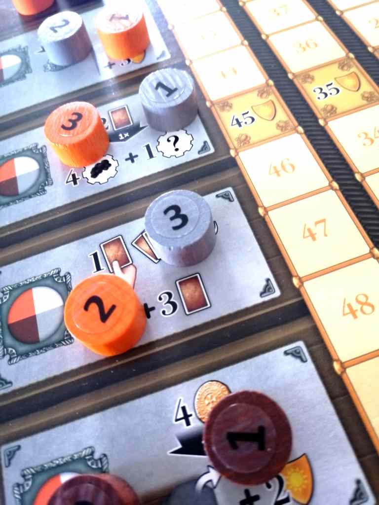 – Actions. A tour de rôle, les joueurs retirent leurs pions d’actions numérotés dans l’ordre et effectuent l’action de la case qu’ils occupaient. Les actions du plateau principal sont :