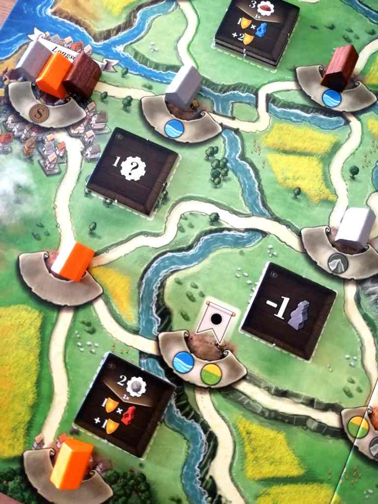EXPÉDITION À NEWDALE est aussi un jeu de placement d’ouvriers et de programmation. En effet, le système de jeu repose sur des choix d’action par placement de pions sur le plateau principal ou sur son plateau personnel. Mais, la singularité repose sur la numérotation de ces pions obligeant à effectuer les actions dans un ordre précis. De plus, la réalisation des actions de production de son plateau personnel dépend en grande partie des assistants disponibles au marché du travail. Ainsi, les joueurs devront ajuster leur envie de production en fonction des probabilités que tel ou tel assistant soit tiré du sac. Cette forte présence du hasard peut surprendre dans un jeu expert, mais elle permet d’injecter une dose de prise de risque rafraichissante et incontestablement ludique au sein d’une machine très bien huilée. La programmation des actions s’avère, de ce fait, complexe et périlleuse. Cette phase peut d’ailleurs être assez longue, le temps que les joueurs dénouent les nœuds cérébraux auxquels ils sont confrontés.