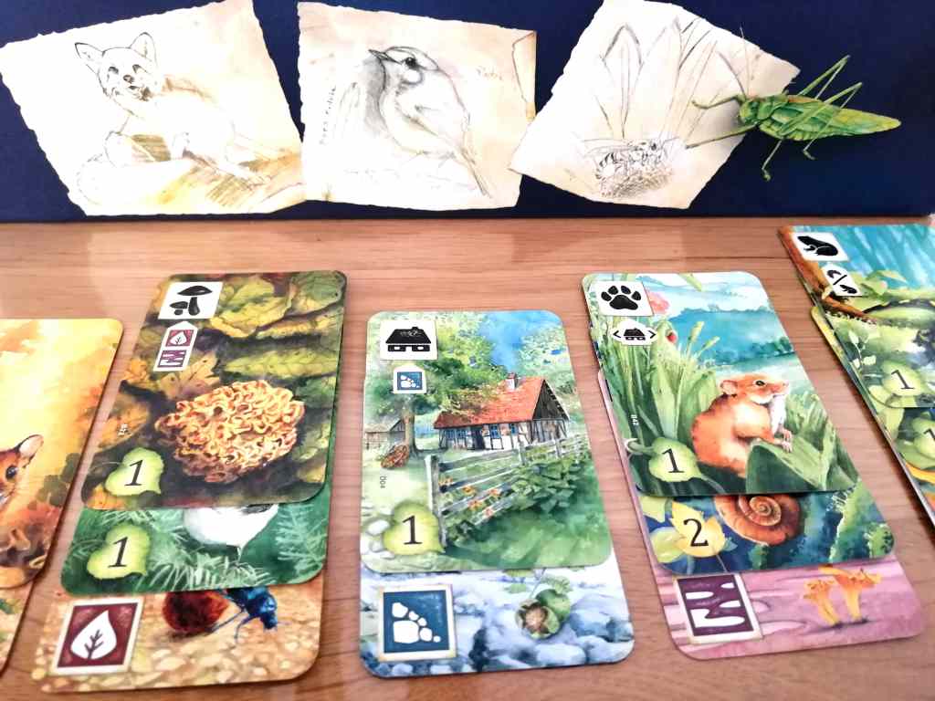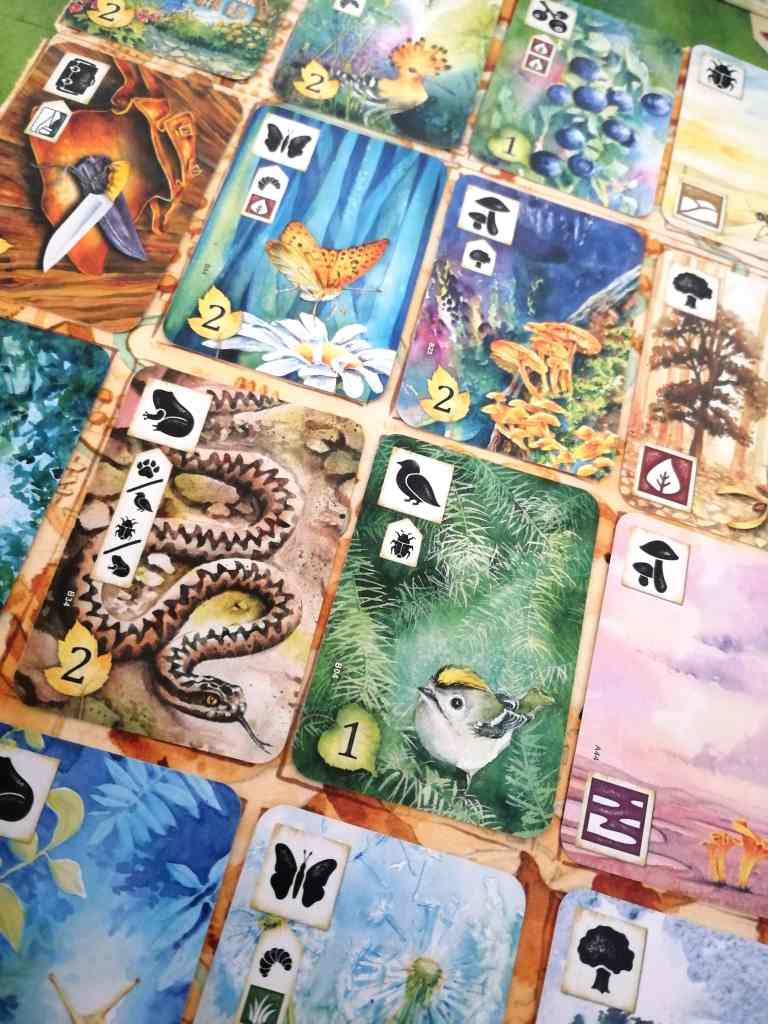 En ce sens, MEADOW est une vraie promenade, mais bien plus intellectuelle que thématique. Certes, les illustrations des cartes tentent de nous faire balader avec douceur à travers les différents paysages à la recherche de la faune et la flore locale. Mais, le jeu s’avère très mécanique, et plutôt solitaire malgré des intéractions présentes autant sur le plan des objectifs à atteindre que des places à occuper autour des deux plateaux de jeu. Chaque joueur est entièrement préoccupé par l’agencement de son tableau de cartes et les enchainements à réaliser. L’anticipation est le maître mot, à moins de se laisser emporter par les nouvelles cartes apparaissant.