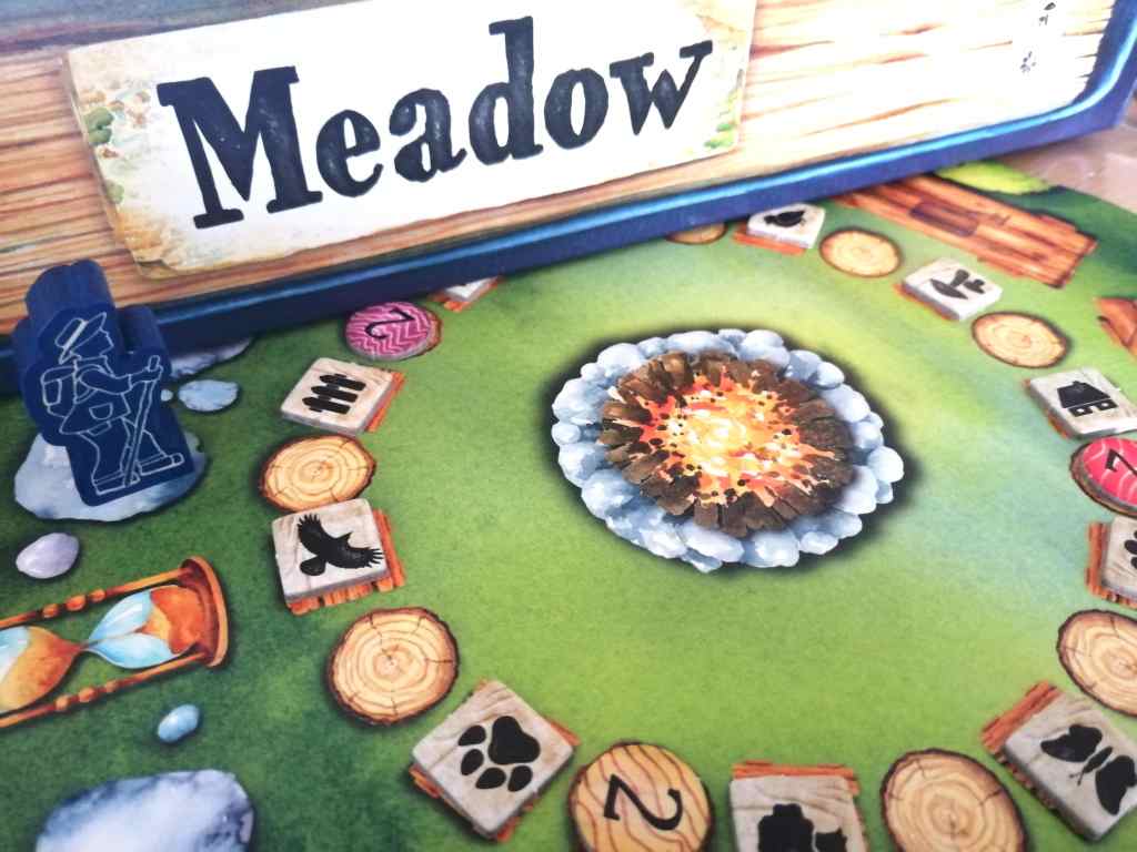 – Sur le plateau Feu de Camp. Le joueur actif place un de ses pions Chemin dans une encoche du plateau et réalise l’action spéciale correspondante à ce jeton. Il est possible de prendre une carte du plateau principal, récupérer deux pions Route, Jouer deux cartes, ou regarder trois cartes d’un paquet pour en conserver une. Il est également possible de placer un jeton Chemin sur le Banc afin de jouer une carte dans sa zone de jeu. Ensuite, le joueur actif peut revendiquer un objectif en positionnant le plus petit de ces pions Bonus entre deux symboles si ceux-ci figurent bien dans sa Prairie.