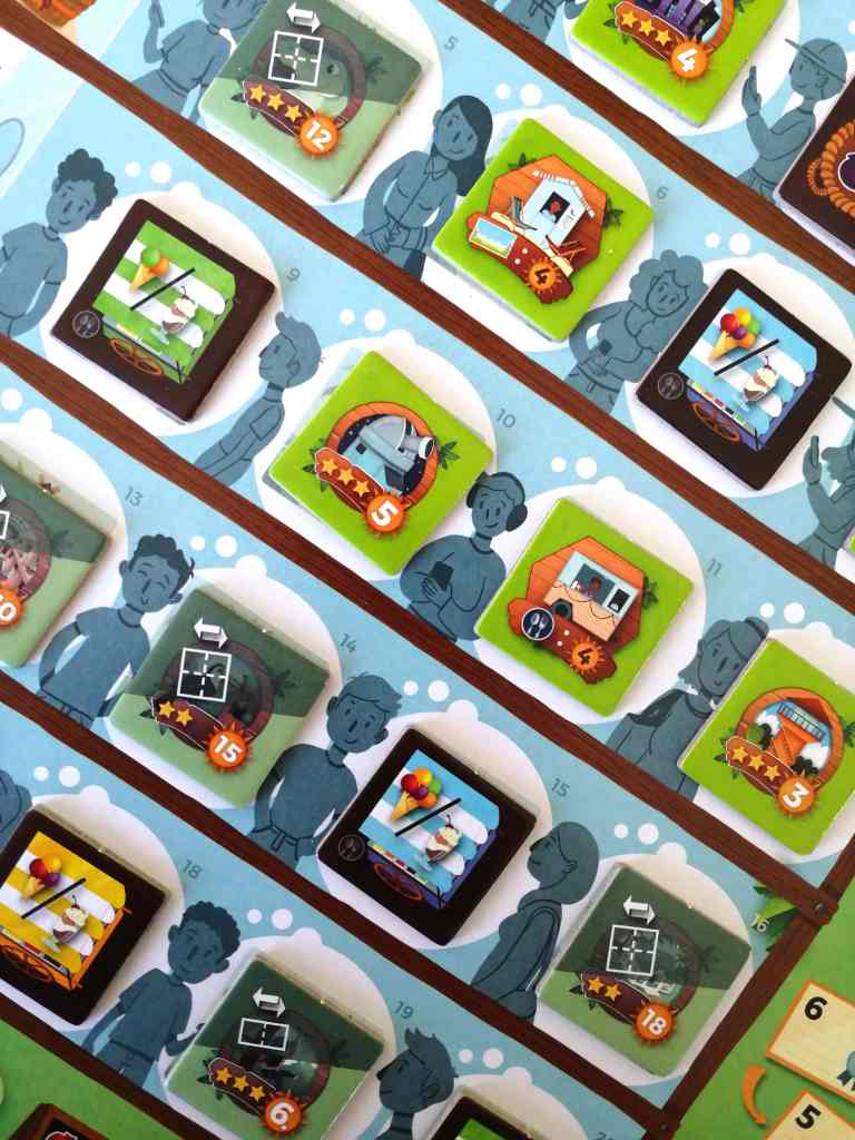 – Ils peuvent livrer un bateau en défaussant les fruits réclamés par celui-ci pour obtenir des points de victoire et libérer la case qu’il occupait ou acheter un jeton Aménagement. Ces derniers sont de deux types : mobiles ou fixes. Les aménagements mobiles sont soit des jetons Récolte présentant deux fruits, soit des jetons Chariot de glace, qui une fois déplacés sur l’île, permettent aux joueurs de faire autant de glace et de milkshake que de cases parcourues. Ainsi, ils défaussent les fruits des parfums demandés contre des points de victoire. Les aménagements fixes sont des petits ou grands bâtiments à positionner sur l’île bloquant ainsi des espaces libres. Ils font gagner des points de victoire immédiats ou selon condition en fin de partie pour les boutiques.