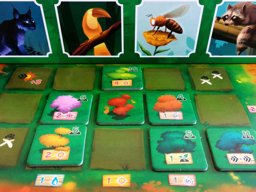 ° Planter un Arbre Protecteur : le nombre de symboles Arbre obtenu sur la ligne d’Aides permet de prendre un Arbre protecteur (de coût égal ou inférieur) et de le positionner sur une case vide adjacente à un arbre déjà posé de son plateau personnel. Les Arbres ainsi plantés accordent des effets (souvent des symboles supplémentaires) permanents durant la partie. Une ligne ou colonne entièrement complétée ajoutent un bonus supplémentaire alors qu’un angle recouvert octroie un bonus instantané.