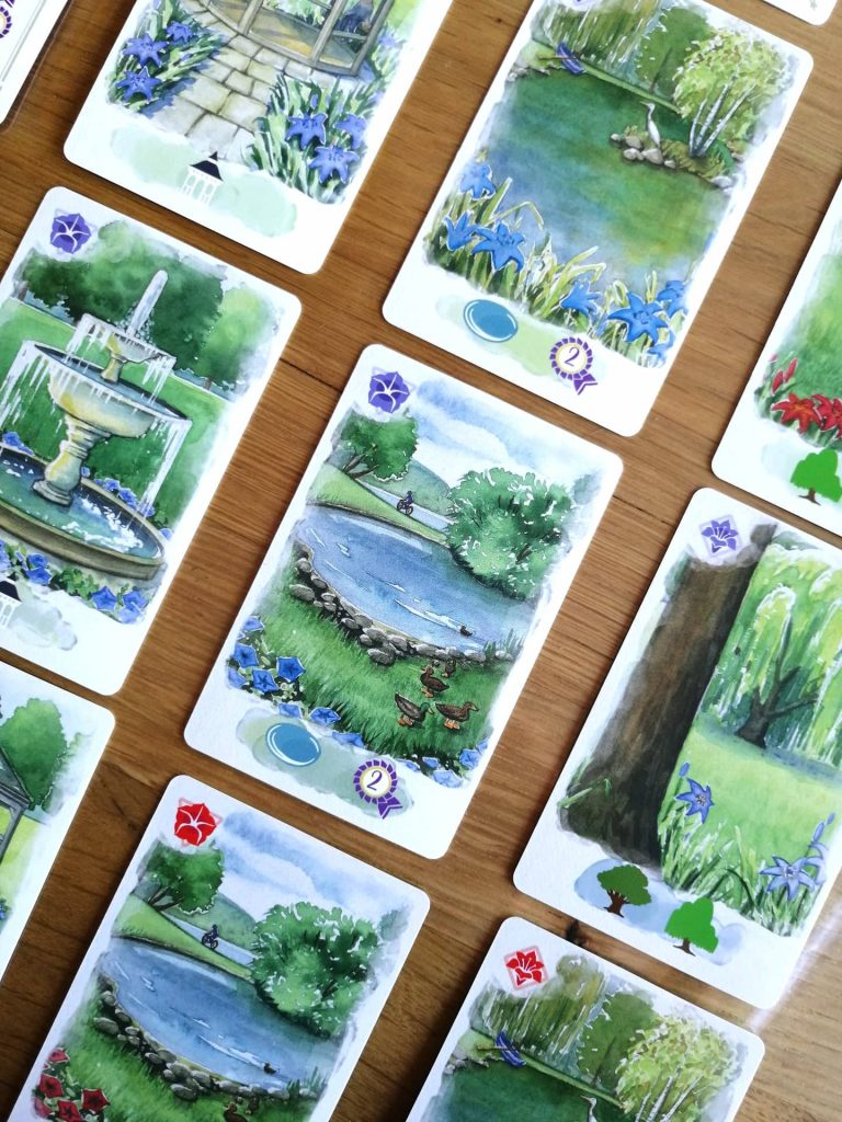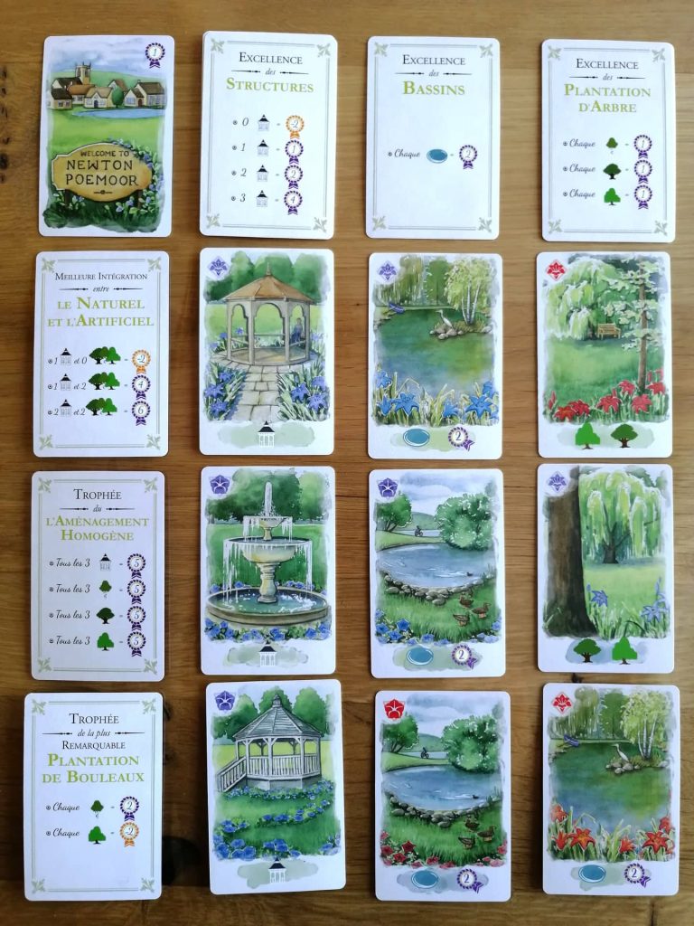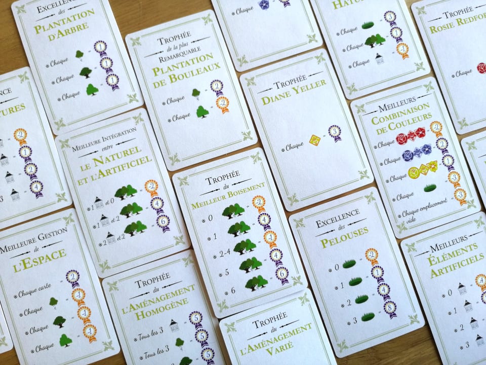 Les Aménagements paysagers présentent divers éléments comme des pelouses (sans fleur et donc sans contrainte de placement), des bassins (rapportant des points supplémentaires en fin de partie), des arbres, ou encore des structures (permettant, une fois ajoutées, de piocher et jouer immédiatement une carte Trophée) alors que les cartes Trophées sont des cartes objectifs.