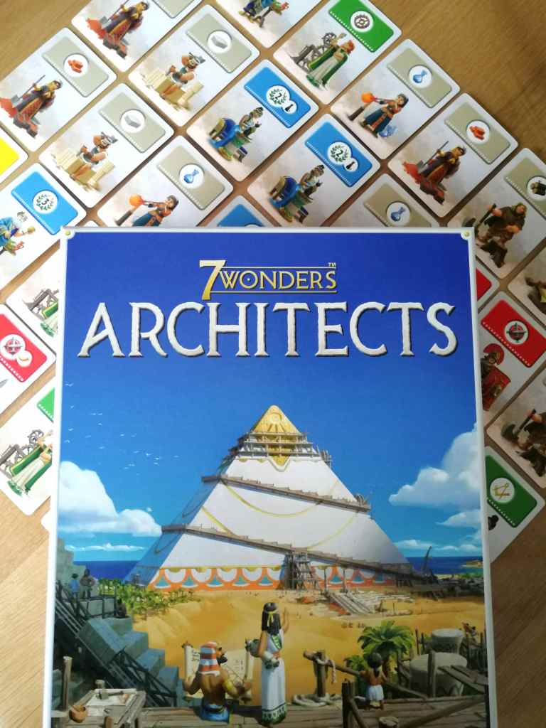Parlons du jeu en lui même. ARCHITECTS conserve l’esprit global de 7 WONDERS en épurant encore un peu plus la mécanique. Les cartes ne sont plus draftées mais choisies dans trois paquets différents. Un tour de jeu consiste donc uniquement à sélectionner une carte et à éventuellement appliquer l’effet de combinaison avec d’autres cartes accumulées qui seront alors toutes défaussées. Les cartes commerciales du jeu initial ont disparues, tout comme les guildes de l’âge trois. D’ailleurs, les noms des catégories de cartes se sont également évaporées. Elles se nomment désormais bleues, vertes, rouges, jaunes ou grises. Leurs fonctions, par contre, n’ont pas été totalement réinventées. Ainsi le fond thématique reste quasiment inchangé alors qu’il est bien question ici de construire en priorité sa Merveille.