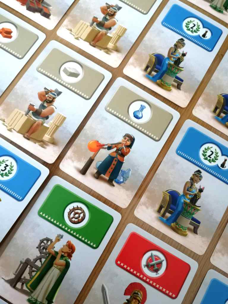 – Cartes Grises et Jaunes. Elles représentent des ressources permettant de construire les étapes de la Merveille en les défaussant. Le joueur actif retourne alors une étape de sa Merveille (dans l’ordre) sur sa face « Construite ». Les cartes Jaunes remplacent n’importe quelle ressource.