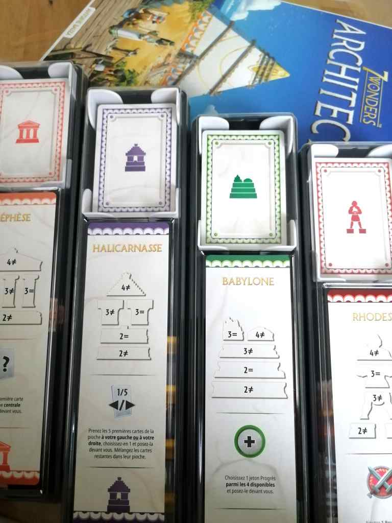 D’ailleurs l’ensemble du jeu est extrêmement bien conçu. Tout a été examiné et réfléchi pour que rien n’entrave le plaisir des joueurs. Les informations des cartes sont très claires, et les symboles des jetons Progrès facilement compréhensibles. Les couleurs des différentes familles de cartes sont accompagnées de symboles pour les daltoniens. La construction progressive de chaque Merveille, avec ses cinq étapes recto-verso, se saisit en un coup d’œil. La règle du jeu est un modèle du genre, entre schématisations, exemples et illustrations. Non vraiment, l’édition est vraiment splendide !