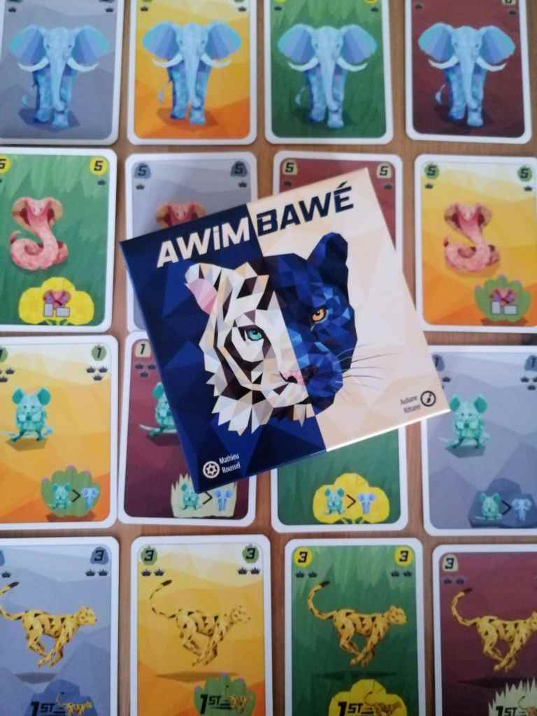 La maison d’édition Explor8 a le don pour trouver des titres de jeux à la fois originaux, marquants et symboliques. Après ANLUDIM, combinant les prénoms des réalisateurs du jeu, voici AWIMBAWÉ, référence aux paroles de la chanson « Le lion est mort ce soir » reprise notamment par le groupe Pow Wow (je viens de perdre les plus jeunes…). Le seul petit problème vient du fait que cette fameuse expression reste très légèrement dans la tête… Rassurez-vous, cela ne durera que sept ou huit jours tout au plus !