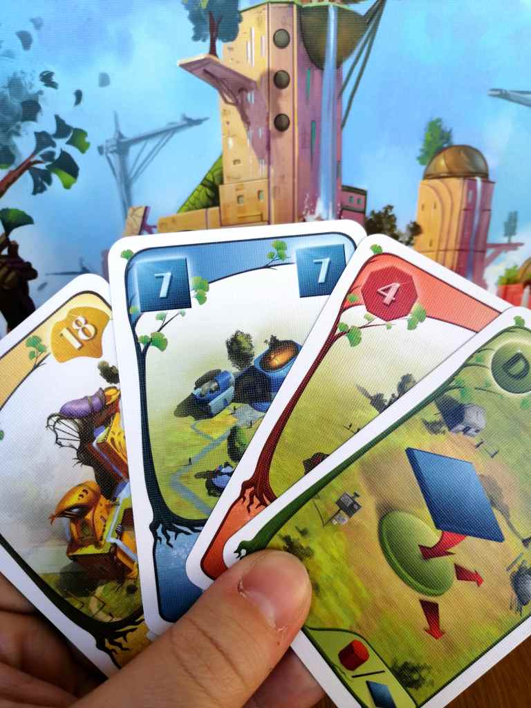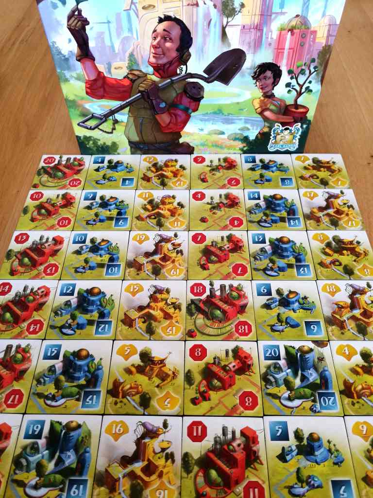 Déjà, une fois la mécanique maîtrisée, le temps de jeu s’approche des 60 minutes, ce qui est le juste équilibre. Une durée supérieure aurait certainement déclencher un sentiment de répétition alors qu’une durée inférieure aurait été frustrante face aux nombreuses opportunités non possibles à saisir. Car Oui, GINKGOPOLIS est un magnifique jeu opportuniste. Il faut réunir les conditions nécessaires à la réalisation d’actions quand elles se présentent. Et étant donné que les cartes sont les supports de chaque action possible, les joueurs vont devoir composer du mieux possible avec. En ce sens, GINKGOPOLIS est très tactique, mais pas que, car seules des réflexions à long terme calculées et subtiles permettent de « monter dans le train » lorsqu’il se présente. Il faut posséder le nombre de ressources nécessaires, ou la tuile compatible avec nos ambitions. Le jeu prend ainsi doucement mais sûrement des allures de gestion.