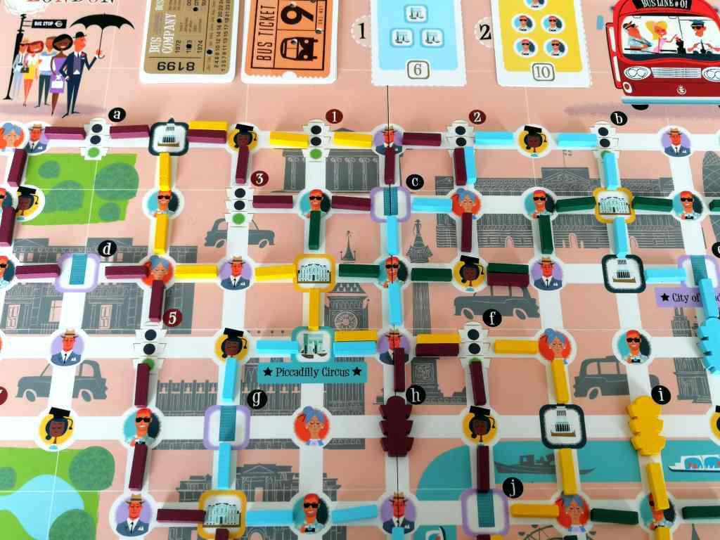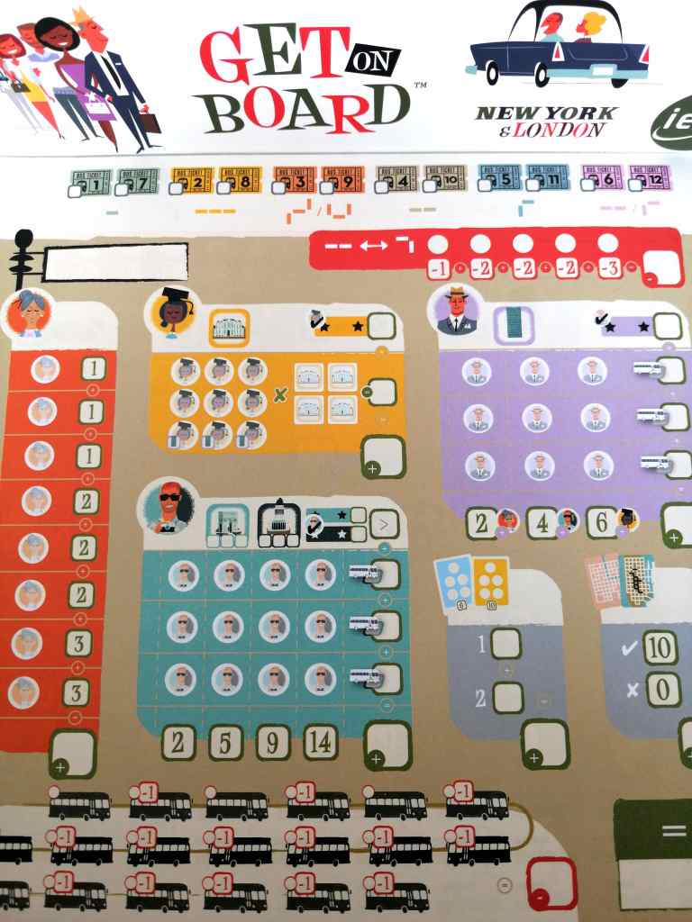 Les joueurs incarnent donc des conducteurs de bus devant transporter chaque voyageur jusqu’à leur destination. Même si les illustrations très colorées rappelle davantage les origines de l’auteur que les cités à parcourir, le pari thématique est tenu de bout en bout. Tout y est, des embouteillages aux feux verts en passant par les lieux emblématiques de chaque ville. Aussi, les caractéristiques des passagers déterminent des points précis à atteindre plutôt que d’autres. Les touristes veulent par exemple se rendre sur les différents monuments de la ville alors que les hommes d’affaires souhaitent rejoindre leurs lieux de travail. Il n’y a aucun doute, GET ON BOARD nous embarque, avec une énergie débordante, dans son histoire, fait assez rare pour un « Truc & Write ».
