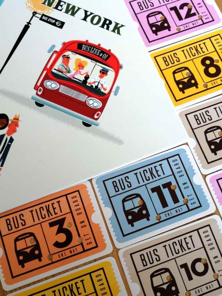 – Nouveau Ticket de bus. Une carte Ticket de bus est révélée par le Contrôleur (premier joueur) indiquant à chaque joueur la section de tracé qu’il doit réaliser à partir de son dernier carrefour atteint (nombre de bâtonnets à positionner et nombre de virages à opérer). Les joueurs cochent en conséquence sur leur feuille de note le Ticket venant d’être dévoilé.