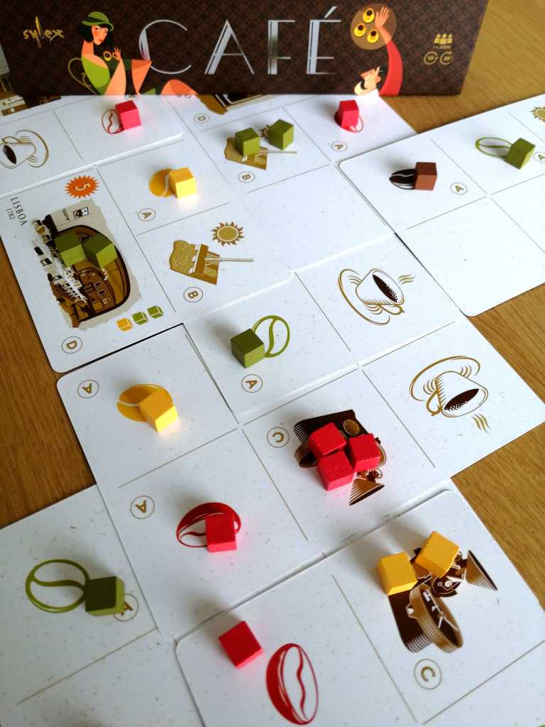 CAFÉ propose un jeu de gestion minimaliste, très tendu et associe pose de tuiles à livraison de ressources avec une belle efficacité. Le thème est intelligemment traité en se concentrant sur l’essentiel. Le manque d’interactions peut plaire ou frustrer selon le type de joueurs que vous êtes. La proposition n’a pas grand chose d’original, mais ce qu’elle fait, elle le fait bien ! L’optimisation est le maître mot. Le défi est relevé paradoxalement aux règles très accessibles, et la rejouabilité est bonne. Les parties courtes permettent une belle progression dans l’enchaînement des parties. Alors, un p’tit kawa ?