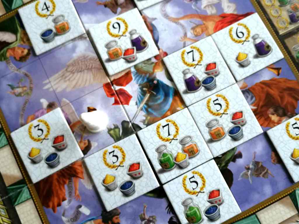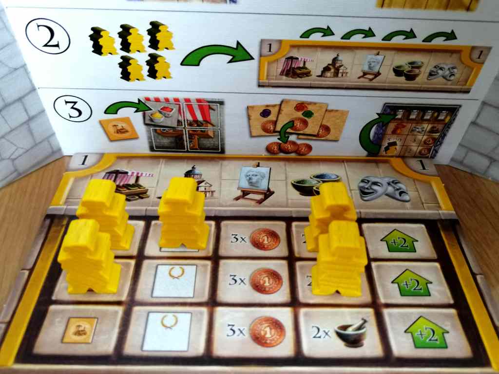 – Préparer le tour suivant. Toutes les tuiles du Marché sont repositionnées au hasard. Les joueurs reçoivent l’argent que leur procure les morceaux de Fresque qu’ils ont restaurés et récupèrent leurs ouvriers positionnés sur les cases d’action.