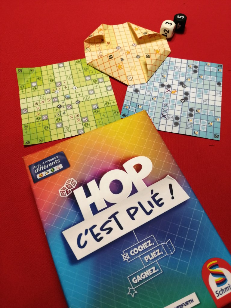 Ici, les dés vont permettre de cocher des cases en ligne droite et surtout des symboles d’une zone, qui une fois tous barrés permettent de plier la feuille pour faire apparaitre les objectifs à rendre visibles pour remporter la partie. Le twist est malin. Il existe plusieurs niveaux de difficulté pour renouveler l’expérience. Les amateurs du genre seront ravis.
