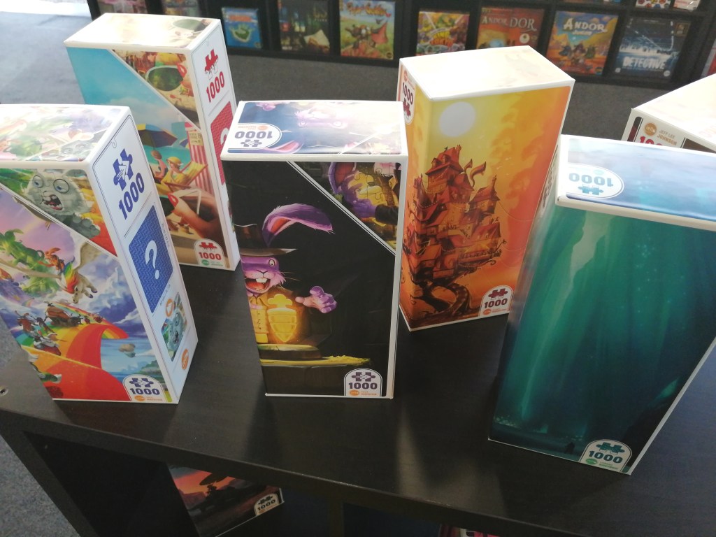 Les illustrations de certains parleront spécialement aux joueurs puisqu’elles reprennent des scènes de jeux de société de l’éditeur. Mais la plus grande singularité provient du fait que le puzzle à réaliser se situe dans une temporalité futur par rapport à l’image mise en couverture. La reconstitution portera sur la « scène d’après ». Ce sont principalement des Puzzles 1000 pièces qui m’ont été présentés. Très envie de les découvrir.