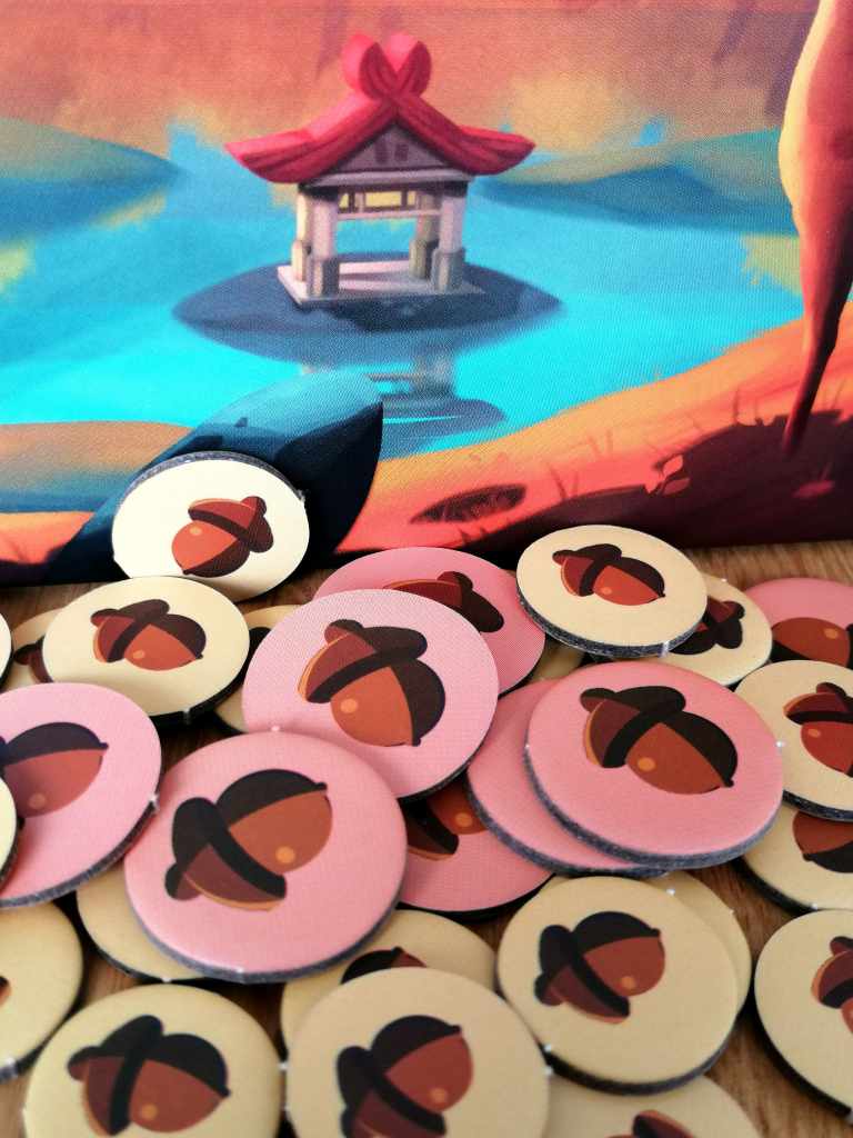 MOMIJI flirte ainsi avec de la gestion, aussi minimaliste soit-elle. Le jeu devient alors bien plus tactique qu’en apparence. Les choix doivent concilier les valeurs des cartes posées, l’emplacement des icônes Gland et la position des piles les unes par rapport aux autres. L’utilisation unique de chaque capacité de Paysage rajoute une dose de tension sur chaque décision, tout comme la réservation au moment le plus opportun possible d’un jeton Objectif.
