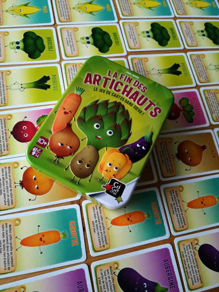 Après Bohnanza et plus récemment Salade 2 Points, la collection métallique de Gigamic confirme son amour pour les fruits et légumes. LA FIN DES ARTICHAUTS est-il à la hauteur de ces deux derniers ? Un indice chez vous… Le jeu a fait sensation au Festival de Cannes 2022 et est déjà en rupture dans quelques boutiques après seulement une semaine d’existence physique.