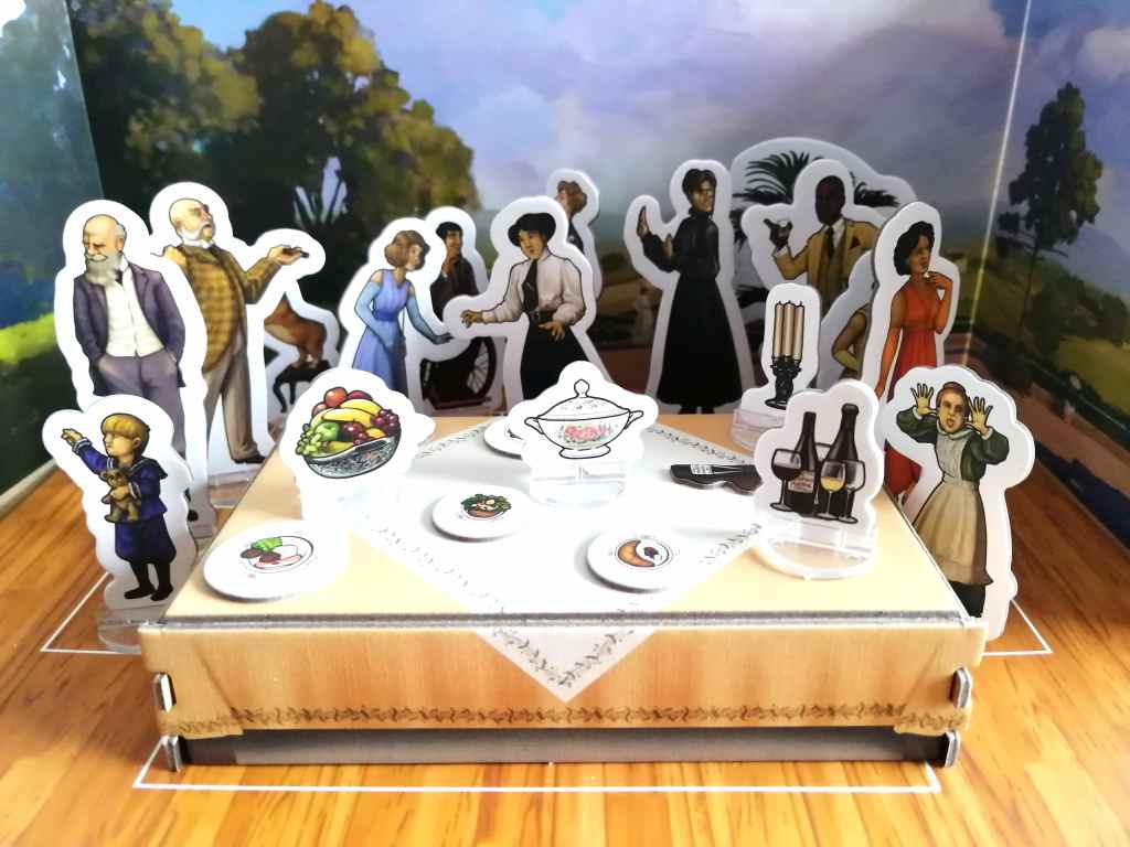 En premier lieu, c’est son look moitié vintage, moitié élégance chic qui attire l’attention. Le matériel est abondant et prend d’ailleurs un certain temps à être assemblé. Les décors et les personnages en carton font de l’effet, d’autant plus lors de la photographie du rendu final. En effet, même si elle n’apparaît pas obligatoire, elle permet de figer une partie dans le temps et dans les souvenirs communs des joueurs. Le plaisir de faire et de regarder les clichés réalisés fait partie intégrante de l’expérience de jeu. Les joueurs deviendront alors exigeants sur les critères à respecter, notamment sur la non visibilité des personnages demandant à être camouflés.