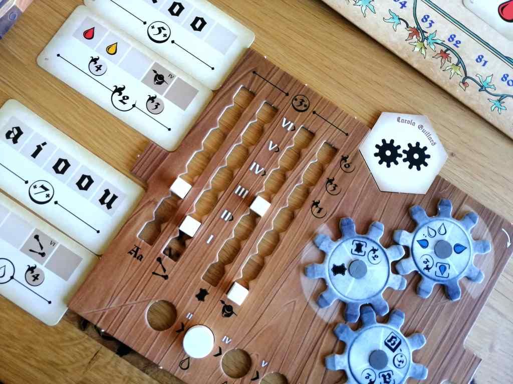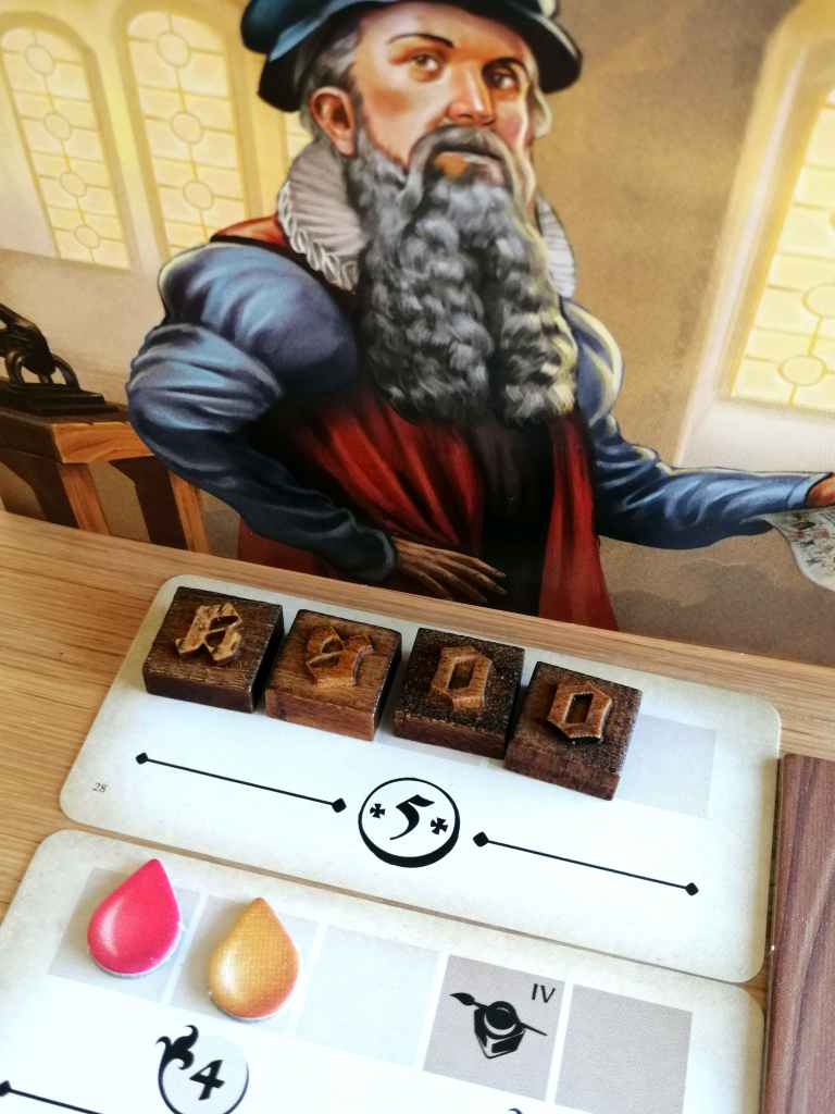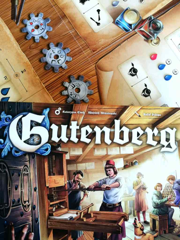 Pourtant, tout est fait pour leur simplifier la vie. Les règles sont reprises derrière les paravents, l’iconographie s’avère efficace et chaque action se réalise dans l’ordre du plateau de jeu, avec des rappels utiles mentionnés à chaque fois aux meilleurs endroits. Si les joueurs semblent quelque peu hagards parfois, c’est sans doute dû aux singularités de forme que propose Gutenberg. Les ressources, que sont l’encre et les caractères d’impression sont singulières par rapport à d’autres titres de gestion. Les bonus d’actions sous forme de rouages pivotant présentent une réelle nouveauté. Ces deux exemples montrent comment Gutenberg créent un effet de surprise parfois déconcertant alors que les mécaniques qu’ils proposent sont pourtant bien plus habituelles.