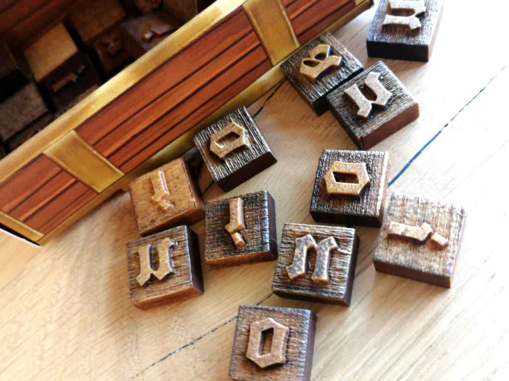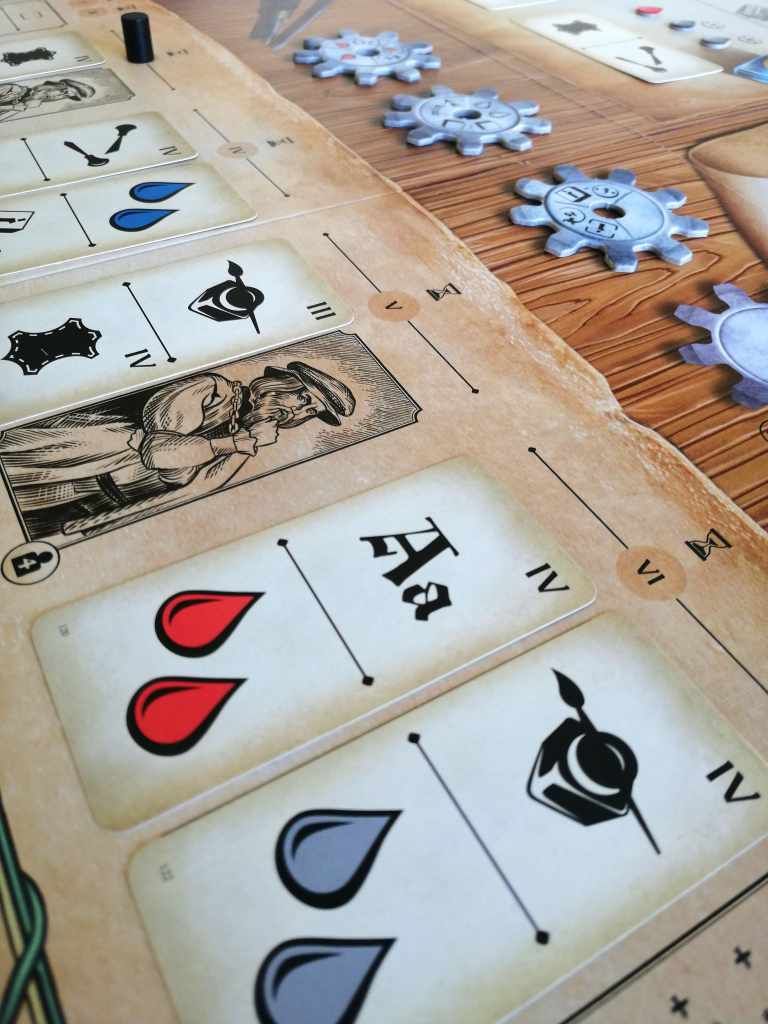 Parlons de l’édition immédiatement. C’est juste superbe. Que ce soit les lettres d’imprimerie en bois, la forme des cartes, le style iconographique ou encore les entrelacements de rouages, tout est absolument impeccable et vient renforcer indéniablement le plaisir de jeu. Pourtant la profusion de matériel a de quoi effrayer et produit, à certains instants de la partie, quelques tournis. Les joueurs peuvent perdre leurs pensées au milieu de ces nombreux éléments, chargés et au style inhabituel.