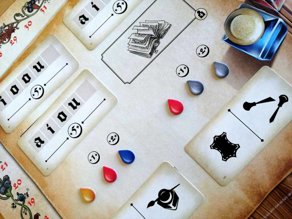 – Compléter les commandes. Les commandes réclament soit des caractères d’imprimerie, soit un niveau de capacité spécifique, soit de l’encre. L’encre est le seul consommable à défausser. Les autres éléments restent en possession du joueur. Les carte Impression obligatoire à compléter font gagner des Florins alors que les cartes Finitions, optionnelles, permettent de gagner des points de renommée. Une commande entièrement complétée donne droit à un bonus supplémentaire. A tout moment, les joueurs peuvent acheter des Caractères d’imprimerie. Leur prix est fonction du nombre qu’ils en possèdent.