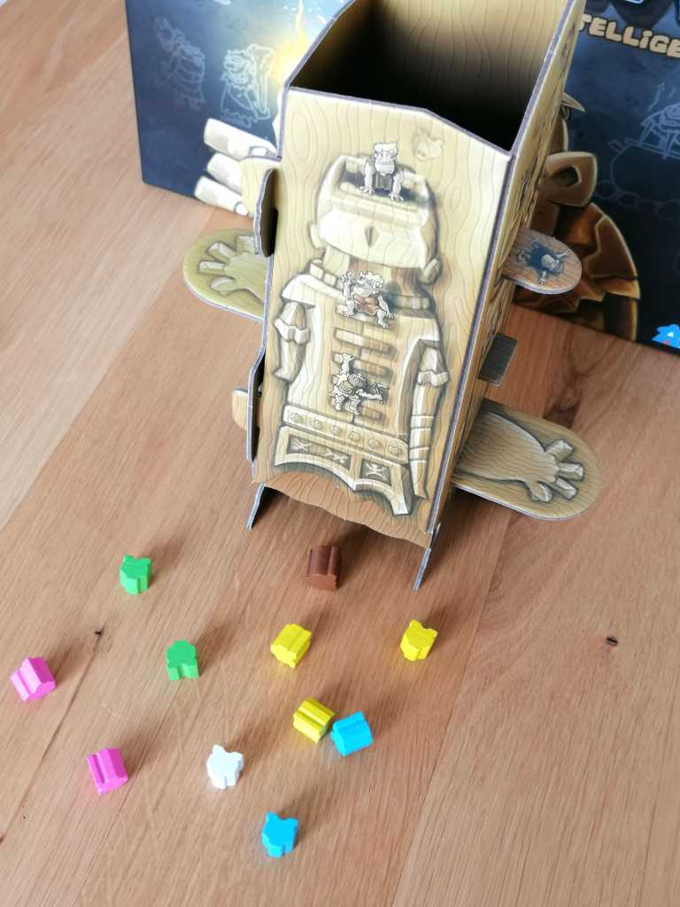 Si le système de jeu repose sur de la pose d’ouvriers, celle-ci prend appui sur des informations invisibles à l’instant T. En effet, les ouvriers sont insérés dans des boîtes fermées. Les joueurs auront donc à mémoriser leurs actions antérieures pour mieux répartir les missions à accomplir. Les objectifs sont relativement simples et communs. Il s’agit de récupérer des ressources pour acheter des cartes valant un certain nombre de points de victoire. Ainsi, la singularité du titre ne provient pas de son fond mais plutôt de sa forme. Les « cachettes » d’actions et la « Tour à Meeples » représentent deux idées insolites, réellement rafraichissantes, joyeuses et donnant un caractère unique au titre.