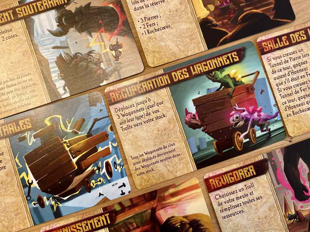 En effet, sa grande originalité provient de la manière de récupérer les nombreuses ressources du jeu. C’est en achetant une nouvelle carte Troll et en la déposant au sommet d’une pyramide de cartes que les joueurs déclenchent leur approvisionnement de ressources par une cascade aussi surprenante que redoutable mécaniquement. Ainsi, chaque icône des cartes sous-jacentes à la nouvelle carte déposée, encore non occupée par une ressource spécifique, sera remplie à ce moment précis. Ceci influe considérablement sur le tempo des actions à réaliser. En effet, le recrutement a tout intérêt à s’exécuter lorsque les cartes Troll concernées par la cascade sont vides et peuvent de nouveau accueillir des ressources.