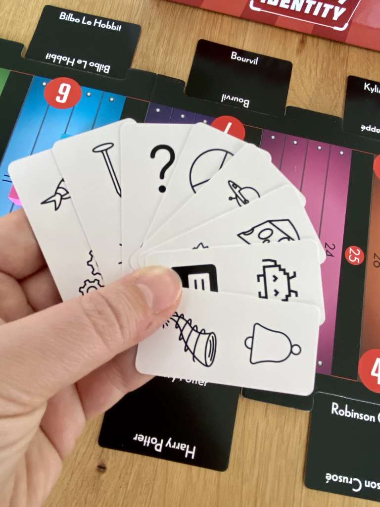Et saugrenues, elles le sont souvent ! En effet, seules dix cartes Pictogrammes sont utilisées pour l’ensemble des quatre manches du jeu afin de faire découvrir quatre identités différentes. Ainsi, les joueurs doivent gérer leur main de carte au mieux, en utilisant au plus justement les pictogrammes. Il serait dommage de gâcher le potentiel de certains, en les jouant prématurément, alors qu’ils pourraient être utiles plus tard. Mais ne pas les utiliser immédiatement peut prétendre à confusion avec un autre personnage, aux points communs forts… Alors, que faire ? C’est la question permanente avec laquelle doivent composer les différents protagonistes, d’autant plus quand leurs cartes pictogrammes ne les aident pas franchement.