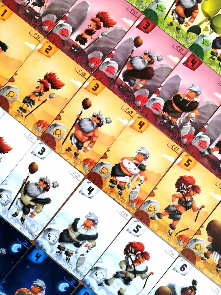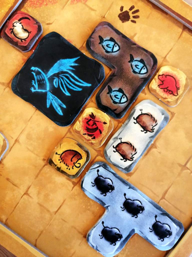 Simultannément, les joueurs vont choisir des cartes « chasseurs » de leur main, qu’ils révèlent en même temps. Le joueur avec le total le plus faible gagne l’initiative et part chasser en premier. Chaque joueur partira donc à la chasse dans l’ordre décroissant des cartes misées. La chasse consiste à choisir des tuiles en assignant un ou plusieurs chasseurs à une ou plusieurs zones de chasse. Chaque zone est caractérisée par deux valeurs de chasse : une valeur sans blessure, et une avec blessure. Les chasseurs, assignés à la zone, selon la valeur qu’ils représentent, reviennent soit intacts de la chasse, soit blessés. En conséquence, le joueur ne piochera pas le même nombre de cartes à la fin de sa phase de chasse. Ensuite, les joueurs doivent positionner dans leur grotte préhistorique les tuiles récupérées, représentant ainsi les peintures de leurs exploits. Les animaux doivent toujours être dans le bon sens et adjacents à une autre tuile « animal ». Si en peignant la grotte, un joueur réalise un ou plusieurs objectifs permanents du plateau de jeu, il place un de ses jetons « Totem » sur chaque objectif réalisé. S’il réalise un ou plusieurs objectifs des cartes « objectifs », le joueur positionne un nombre de jetons ‘Totem » indiqué sur la carte, selon s’il est le premier à le réaliser ou non.