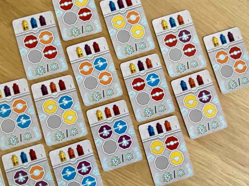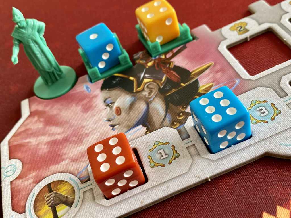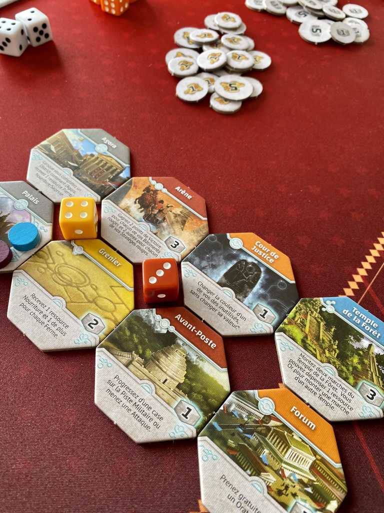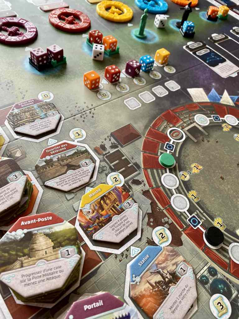 On se prend alors à rêver d’un titre plus épuré oubliant la piste de guerre et celles des Temples pour se concentrer uniquement sur les roues d’actions et la construction de bâtiments à agencer et à activer. En effet, l’une des principale façon de remporter des points s’avère être la constitution d’un mini-puzzle de tuiles respectant des codes couleurs donnés par des objectifs de début de partie. La fin de partie consacre même cette organisation entre les tours réalisées et les dés positionnés de manière centrale dans chaque district pour remporter des points. Mais les dés ainsi placés ne peuvent plus être utilisés comme ouvriers… Il faut jauger si ce sacrifice en vaut la chandelle… Et c’est un sacré casse tête, qui impose un niveau de réflexion élevé et déclenche une course aux objectifs très interactive.